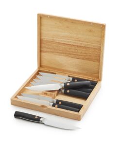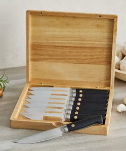 Sharp, stunning, and sturdy—this 8-piece steak knife set is perfectly designed for every juicy cut. Crafted with precision-forged stainless steel blades, each knife effortlessly glides through your steak. Housed in a sleek wooden box, this set delivers slicing sophistication.