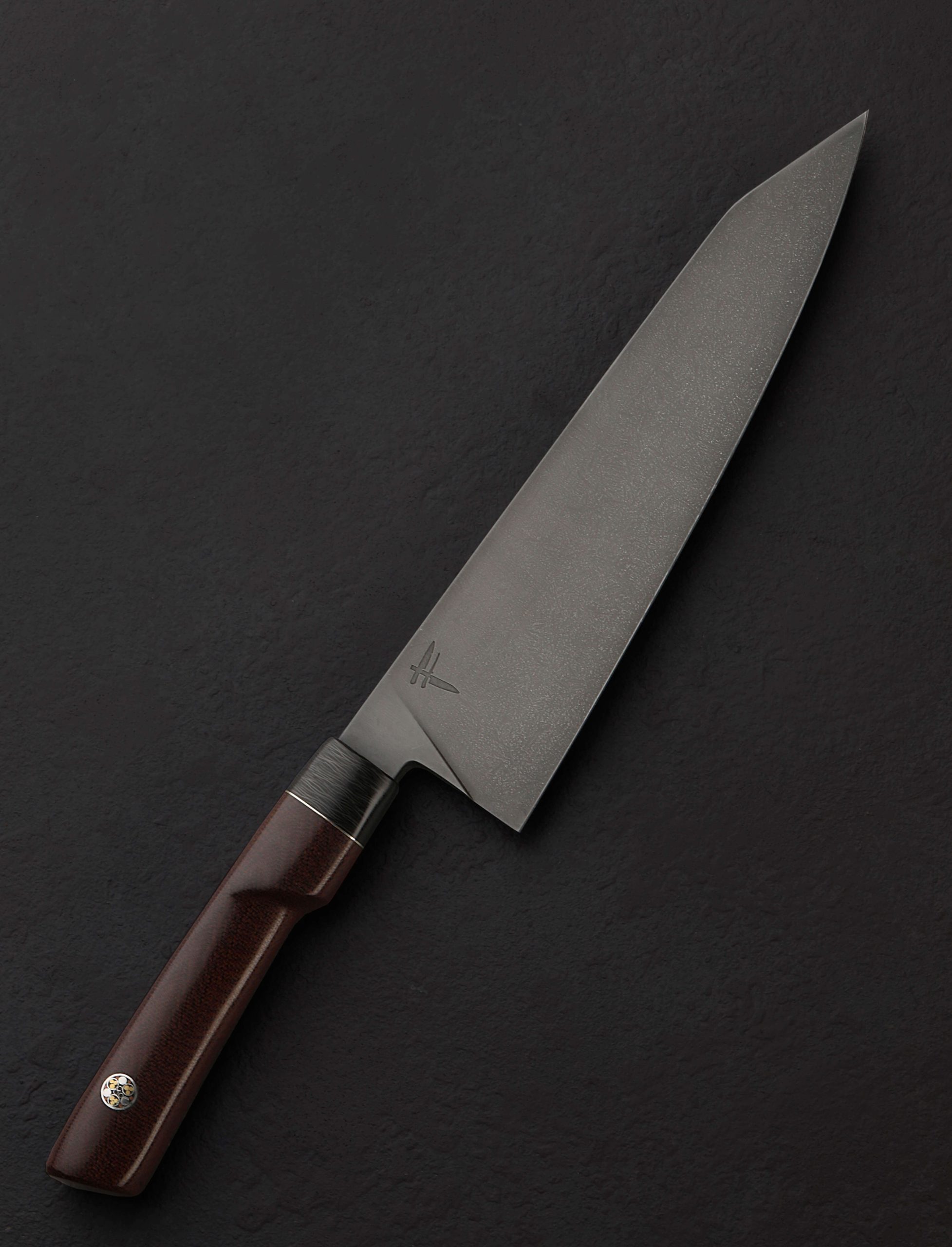 An elegant, all-business Fingal Ferguson build in like-new, pre-owned condition is available to grace a new kitchen with its 220mm / 8.7″ chef’s profile in 52100 carbon steel with a dark, matte forced patina. Standing 56mm tall at the heel with a hard, sharp, workhorse edge and profile that both rocks nicely on the board while also offering a low, pointed tip for detail work, this tool can easily become the go-to prep knife in any kitchen. Crafted for cutting performance, the knife is balanced wonderfully just in front of the handle, the blade’s spine and choil rounded for comfort in the pinch grip. For control in the pinch, hammer, or any other grip, Fingal’s unique and recognizable handle profile excels, this one-of-a-kind build sculpted from dark brown micarta with gorgeous texture and a smooth finish, paired with a tapered and rounded carbon fiber bolster, a polished steel spacer, and an oversized mosaic pin that will turn heads.