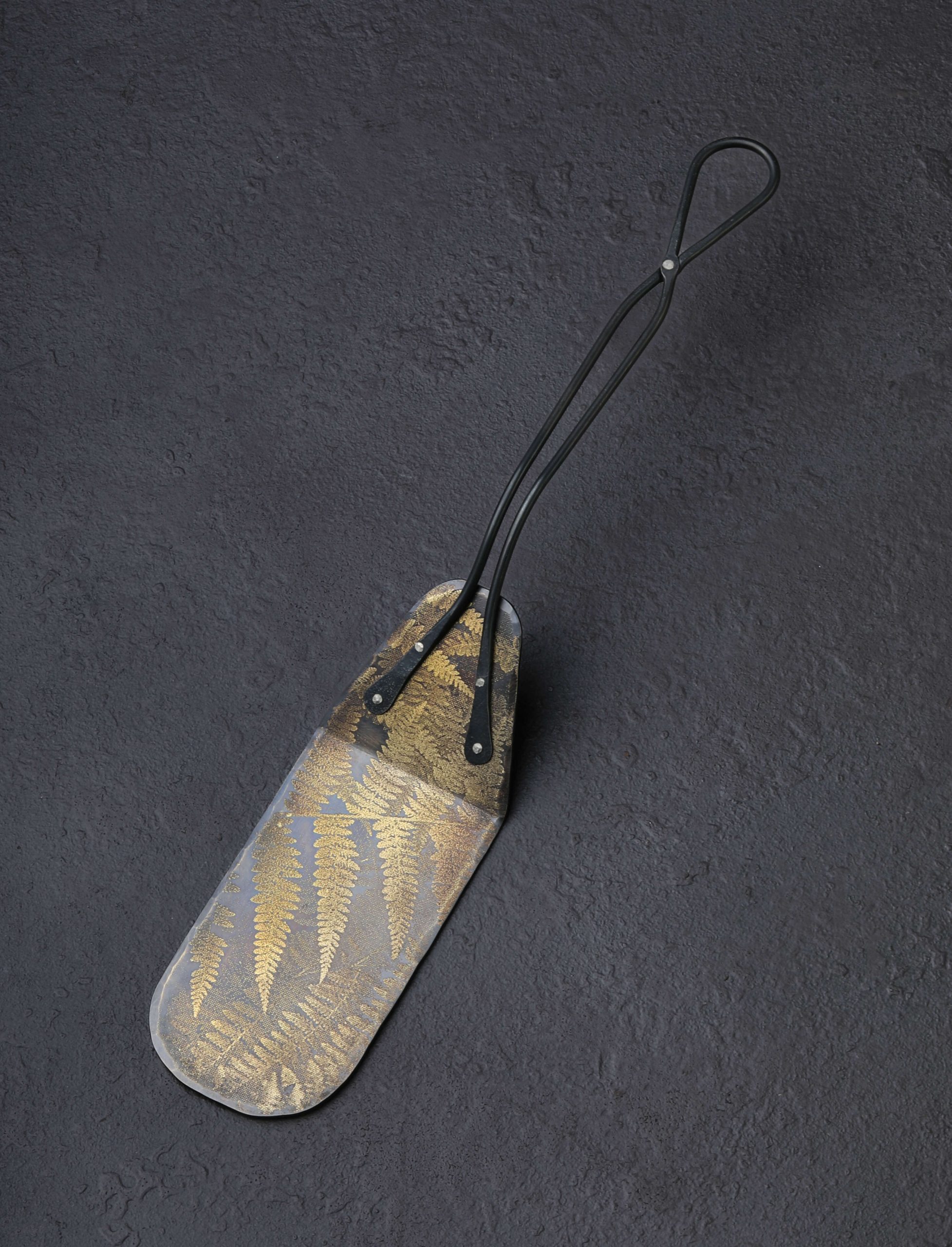 Hand-hewn by artist, blacksmith, papermaker, and printmaker Michelle Kwiecien, this beautiful turning spatula is but one form of culinary art from Foliage Collection of heirloom culinary objects. Combining techniques that span her wide-ranging resume of craft experience, the photo-etched fern imagery which graces the solid brass head is inspired by intaglio printmaking. A feeling of nostalgia and warmth is exuded from each spatula, crafted one by one at Michelle’s Philadelphia studio, from the elegantly forged stainless handle to the simple, hammered steel pins and head-turning, patinated brass. Crafted in small batches exclusively for us, each spatula is a one-of-a-kind.