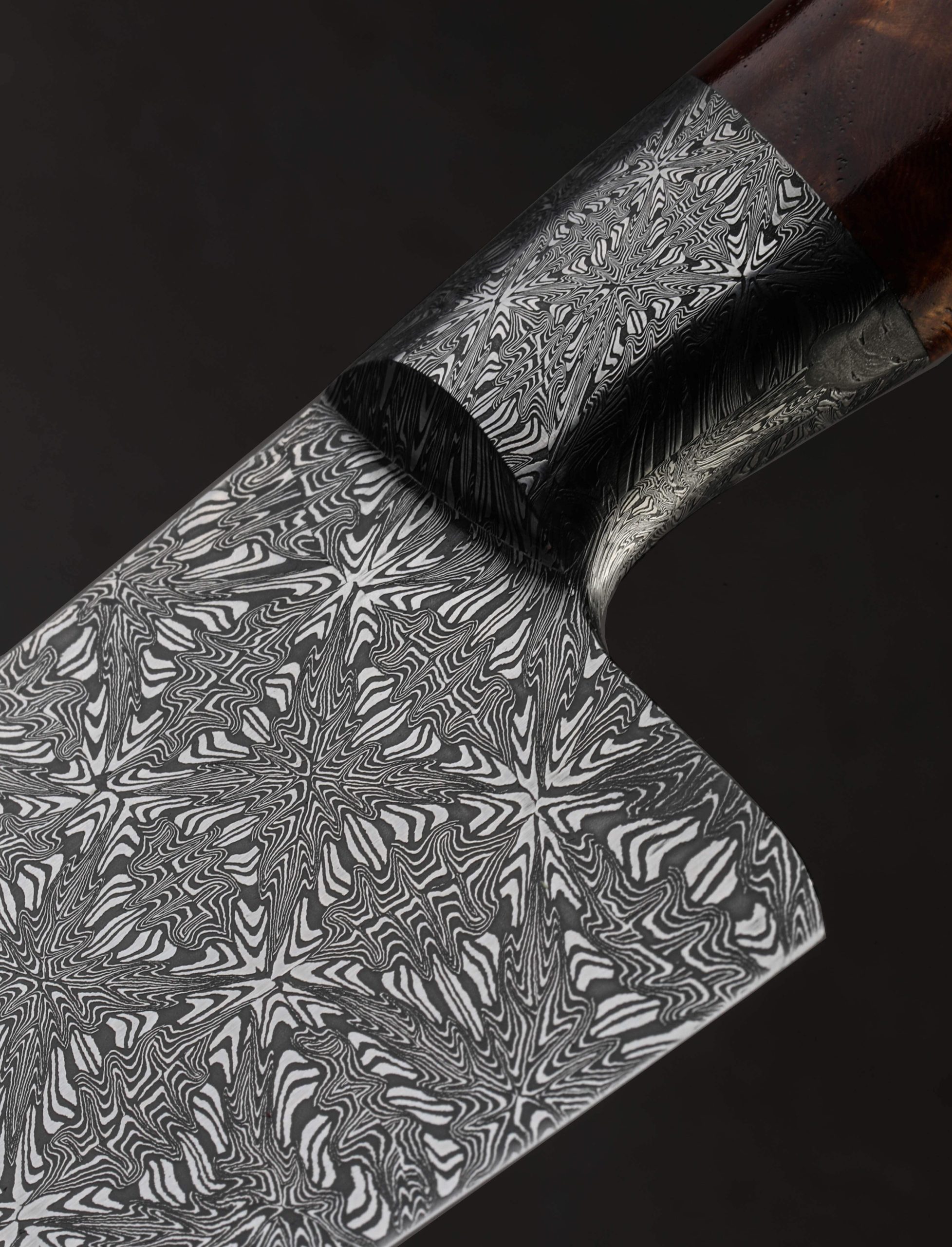 The breathtakingly designed and masterfully crafted damascus pattern by Master Bladesmith Aaron Wilburn is nothing short of stunning, gracing both blade and integral handle bolster of this one-of-a-kind chef knife. With 272mm / 10.7″ of razor-sharp edge beneath thin, slightly convex bevels and an upswept profile that rises to a needle-like tip, this full-size blade will excel at all manner of daily meal prep, from long, precise slices, to chopping, dicing, and julienning with the stiff, sturdy rear portion of its length. A full-distal taper along the spine slims from 3.4mm above the heel, to 2.6mm at the midpoint, to barely 1mm an inch from the tip, resulting in a dynamic and versatile tool that enjoys a touch of lateral flexibility in the front third. Throughout the blade’s bevels and the forge-welded integral bolsters are countless details and layers of steel through which the eyes travel, the near-three dimensional chatoyance producing a glistening sheen as the material reflects light and soul. For comfort, control, and a more-than-tangible connection with this beautiful object, Aaron, sculpts a Western style handle from a piece of amboyna burl that boasts color, grain, and character deserving of the damascus which it complements. Balancing half an inch in front of the blade’s heel, this extension of the chef’s hand is quick, nimble, and steady in the hand.