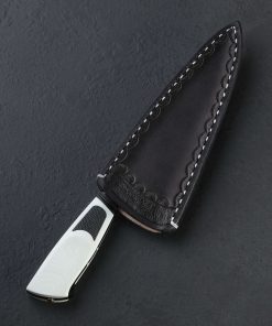 We cannot get enough of part-time maker Joshua White’s thoughtful work, so we were thrilled to have him visit our NYC office recently, leaving in our humble hands this gorgeous new one-of-a-kind chef knife. Josh’s style is unique, always eye-catching, and without fail, designed for cutting performance in kitchens large and small. Whether a home chef on the weekends or a professional chopping for hours a day, Josh’s balance and geometry tells the story of a hard-use tool at first touch. In house-made san mai steel clad with wrought iron, 1084, and 15n20 damascus over a 1095 high-carbon steel core, the Frosted Damascus Chef represents Josh beautifully. Balancing just at the blade’s heel above which the rounded spine measures an robust 5mm across, the knife is weighted and full in the hand, its 9oz / 256g overall weight combining with Josh’s outstanding, free-hand convex bevel geometry to produce a blade that moves effortlessly through ingredients, its heft doing its portion of the work and saving the chef’s energy at the same time. Tough and rigid throughout its length, the 187mm / 7.3″ blade’s spine nonetheless continues to slim gradually forward, from 5mm to around 3.8mm at the midpoint, and further still until reaching a fine, needle-like tip perfect for detail work, making this a versatile and well-rounded knife in an ideal overall size. Relatively straight is the edge profile near the heel where the blade stands a full 60mm tall, ensuring its ability to chop with speed and efficiency no matter how large or dense the ingredient. Rounded for comfort in the pinch grip, both the spine and choil are purposefully shaped and finished. The handle, both comfortable and a work of art in its own right, enjoys black and white G10 paired in a layout that we have seen from this New Jersey artist before. A frame of black, carved with handsome details from front to back and capped with a fluted ferule, is surrounded by nicely sculpted white scales that are inlaid with knurled black highlights. At the handle’s rear, allowing for its removal in case care and maintenance are needed is a domed bronze retention bolt screw. Included is a handmade leather saya.