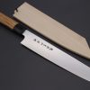 This knife comes with octagonal magnolia wood handle with a water buffalo horn ferrule, and also includes a matching magnolia wooden Saya (Sheath) for safekeeping.