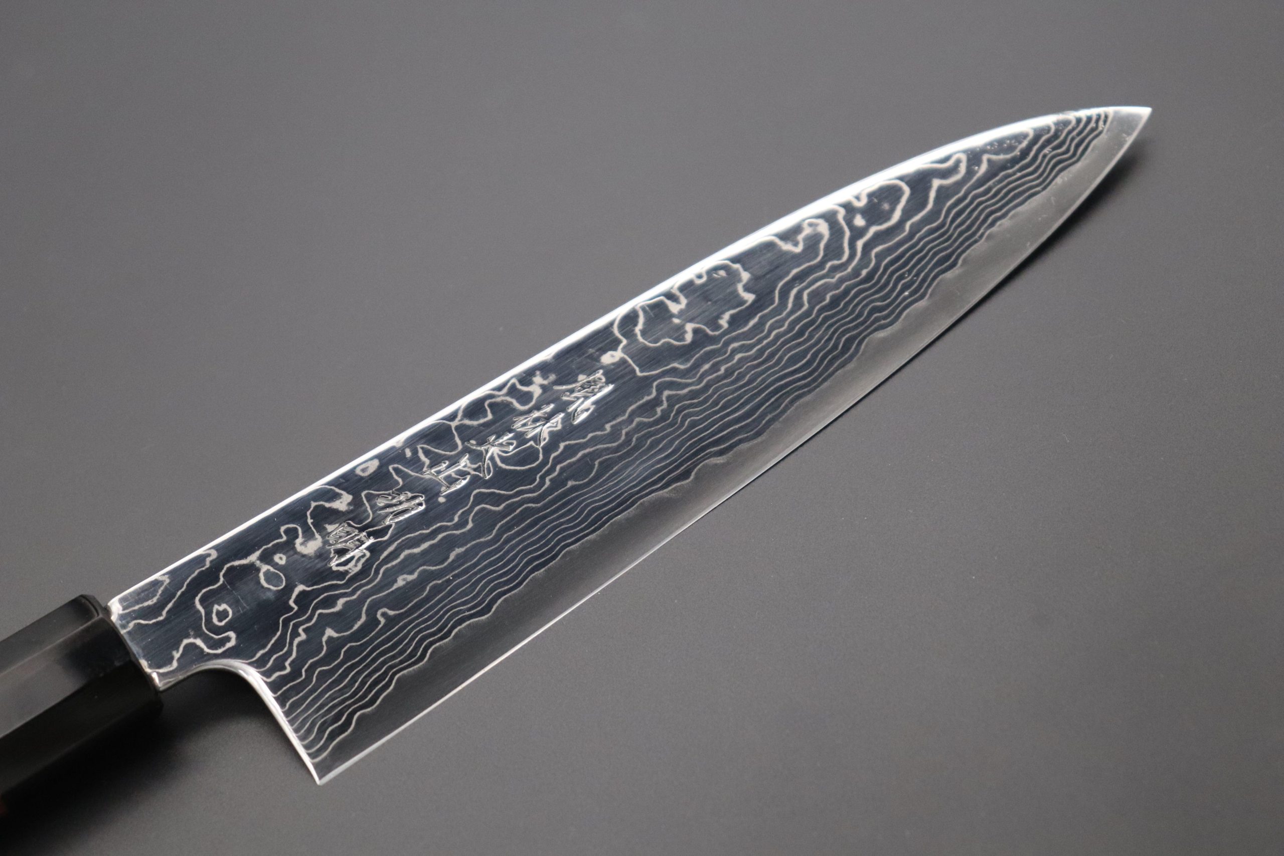 This beautiful Damascus Wa Gyuto is forged and hand crafted by passionate forge smith Sukenari using R-2 steel. R-2 (Also known as SG-II ) is a high-quality Powdered Metallurgy (P.M.) High Speed Tool Steel from Kobelco. R-2 has a very rich chemical composition, which includes Carbon 1.25-1.45 %, Chromium 14- 16%, Molybdenum 2.3- 3.3 %, and Vanadium 1.8- 2.2 %.