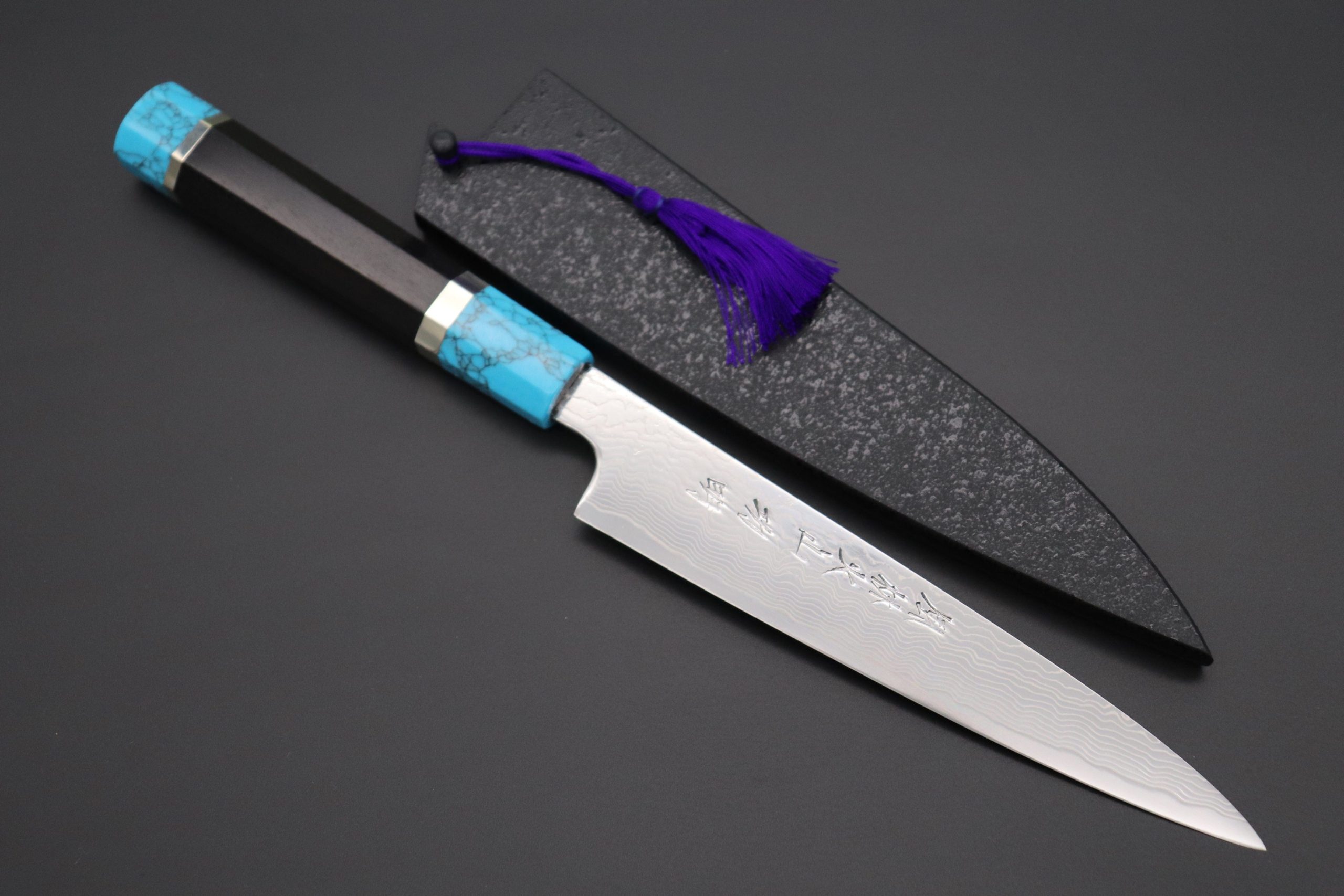 To enrich your cooking experience and suit a wide variety of needs and preferences, this Fu-Rin-Ka-Zan R-2 Clad FRDYP-11 Wa Petty features an Innovative Octagonal Ebonywood Handle with Turquoise Composite Stone Ferrule & Butt. A matching Black Lacquered wood Saya (Sheath) with a black pakkawood Saya pin is also included with the knife.