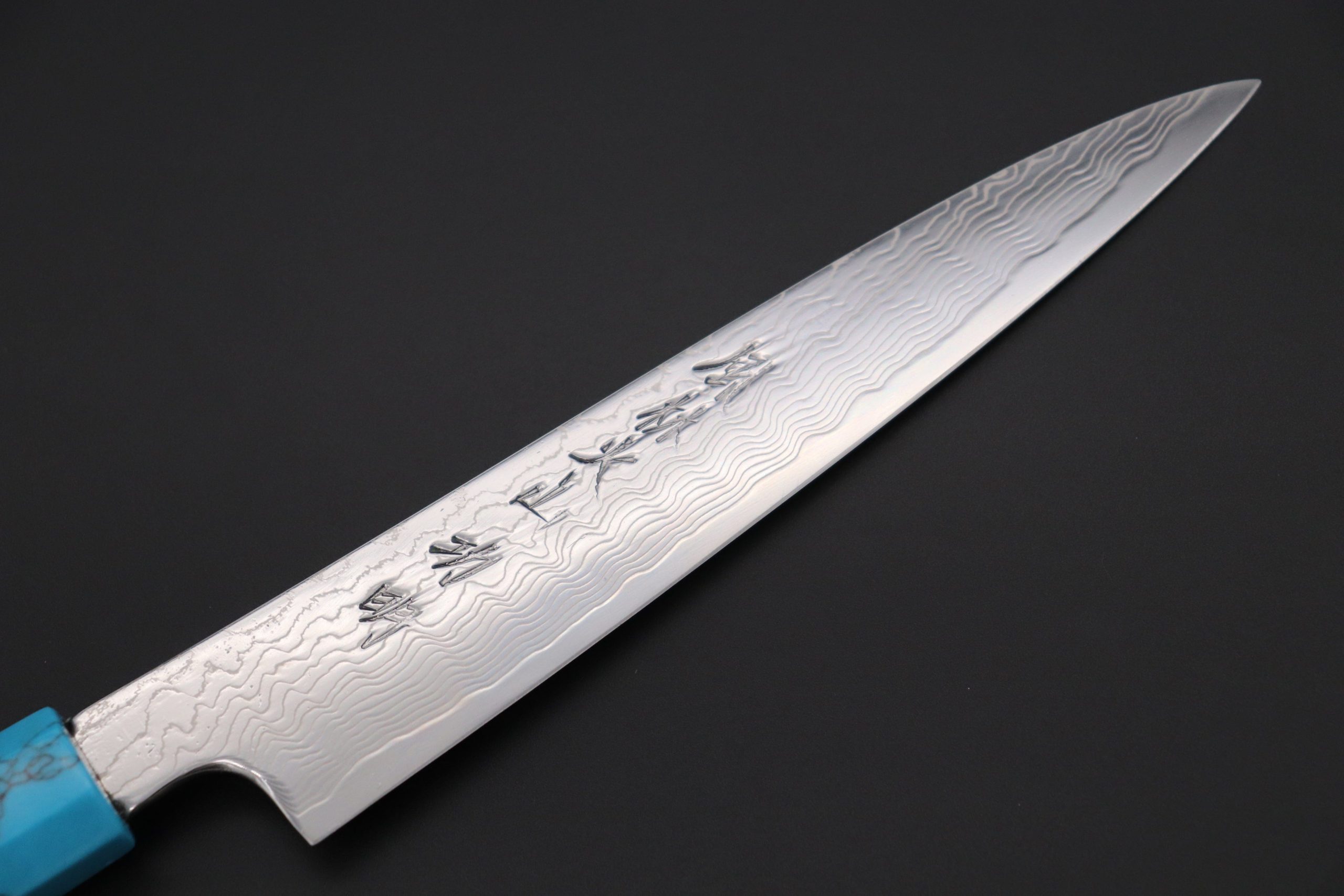 Master Hanaki, the President of Sukenari, has crafted these very practical and special Powdered High Speed Tool Steel knives with an R-2 blade core / cutting edge (HRC. 63) and attractive Wavy Damascus cladding.