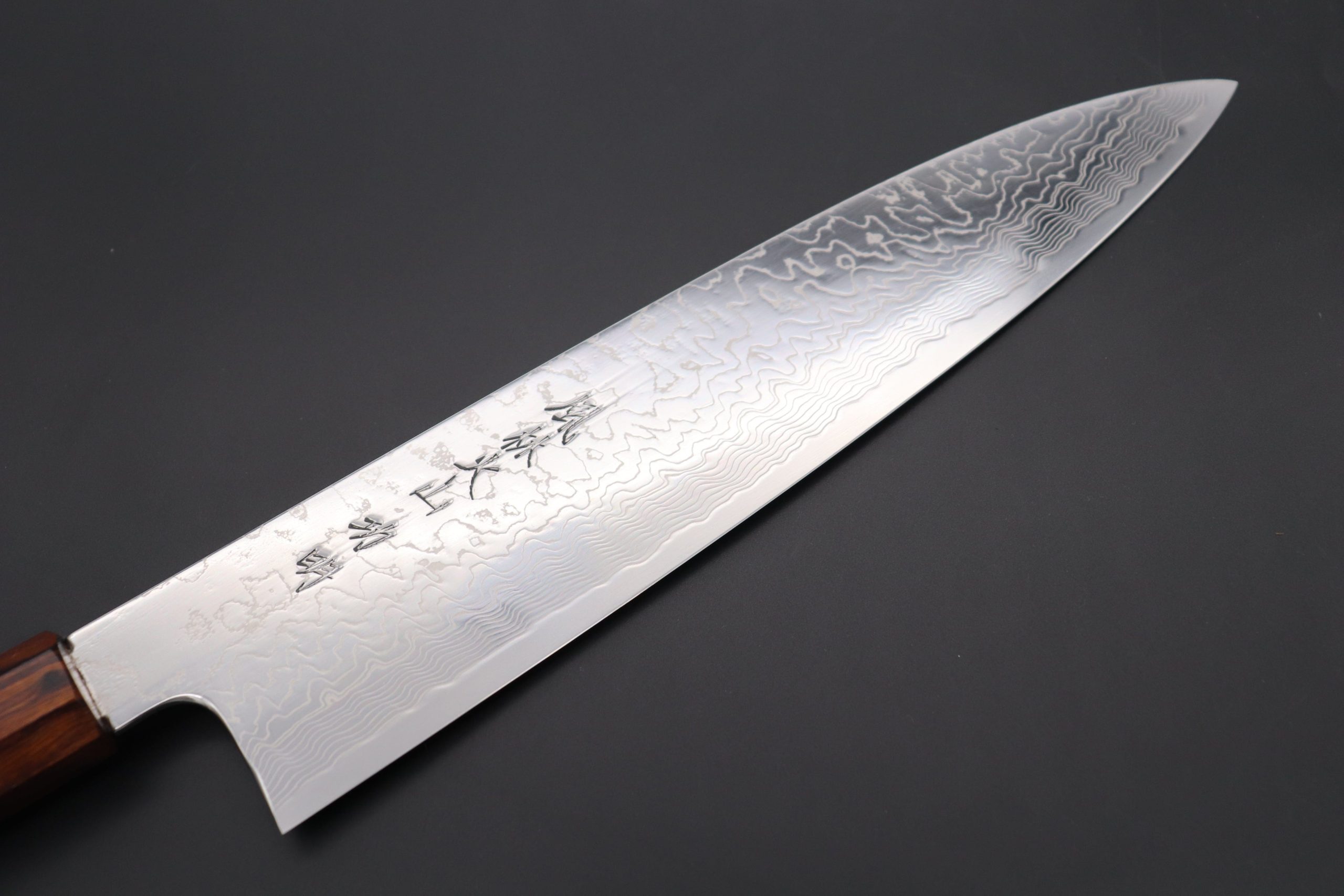 This beautiful Damascus Wa Gyuto is forged and hand crafted by passionate forge smith Sukenari using R-2 steel. R-2 (Also known as SG-II ) is a high-quality Powdered Metallurgy (P.M.) High Speed Tool Steel from Kobelco. R-2 has a very rich chemical composition, which includes Carbon 1.25-1.45 %, Chromium 14- 16%, Molybdenum 2.3- 3.3 %, and Vanadium 1.8- 2.2 %.