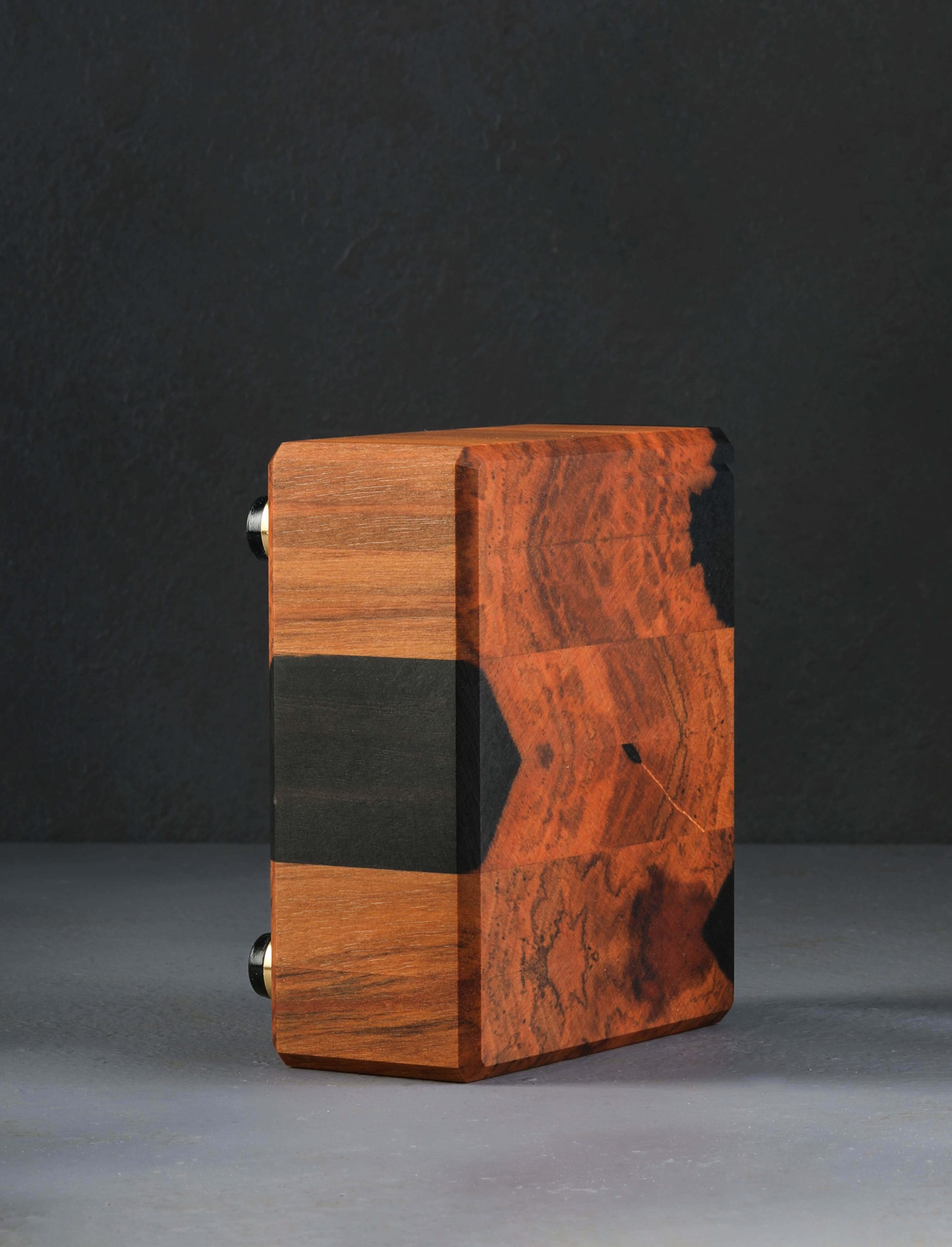 Vibrant and unique are the newest pair of bar boards made specially for Eatingtools by Canadian artist Luke Martin, the owner and sole operator of Owl Woodworks. Known for his woodwork of the highest caliber and attention-to-detail (likely facilitated by his former career as a bomb technician), Luke has delivered boards that continue to impress. Crafted of Gaboon Ebony that boasts a stunning contrast of colors and grain, the boards feature brass, stainless steel, and silicone feet that ensure a stable cutting experience as you prepare garnishes, mince garlic, or chop herbs for the kitchen and bar alike. A beautiful piece to offer versatility to any space.