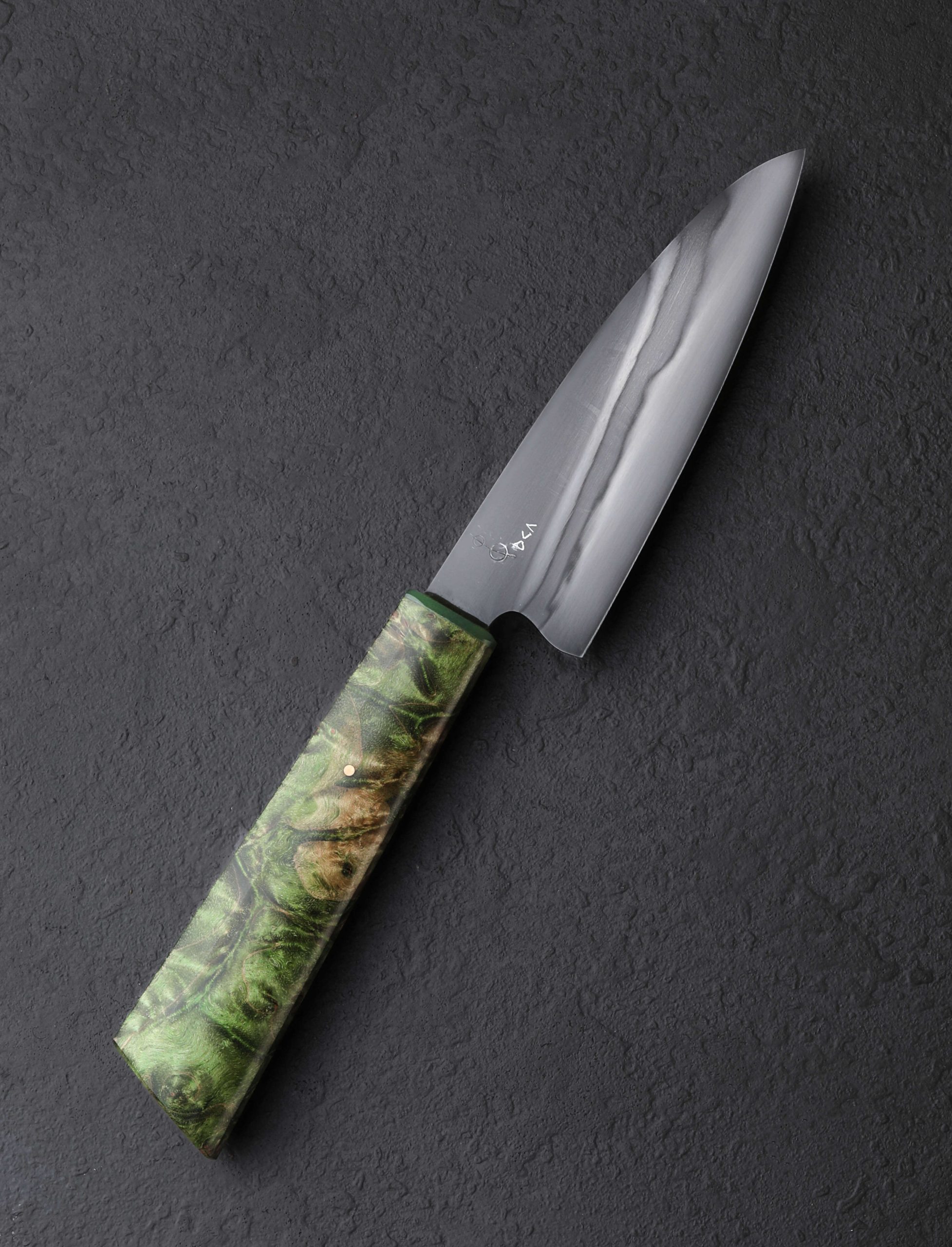 Combining attributes of a petty chef blade profile, paring knife, and yes, a santoku, Don Carlos Andrade has, as he’s done many times before, shaped a novel, unique, and endlessly versatile profile for the professional and home kitchens alike. Meet, the Micro-Santoku. At 126mm / 5″ long, with a 26mm-tall heel that allows it to rock on the board as needed, the compact blade enjoys Don’s incredible free-hand convex bevel geometry, and a full-distal tapering along the spine to produce a tool that can perform nearly any cut during daily meal prep. Boasting his beautiful rainbow quench, Don reveals this carefully orchestrated differential hardening of the 26c3 ‘Spicy White’ carbon steel through his well-loved polishing and hand-sanding process. To complete the one-of-a-kind build is a handle in Don’s shield-profile wa handle rendition, tapering from back to front with a combination of flat and curved faces that are as comfortable and ergonomic as they are visually arresting. Sculpted from stabilized maple, the grip is capped with a ferrule of lime-green translucent G10 laminate and secured with a single flush brass pin.