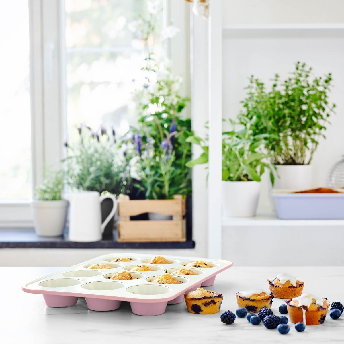 Made of heavy-duty steel for quick and even heating, this muffin pan is built to last through countless baking sessions. This healthy ceramic muffin pan offers effortless release for everything from sticky buns to pineapple upside-down cupcakes.