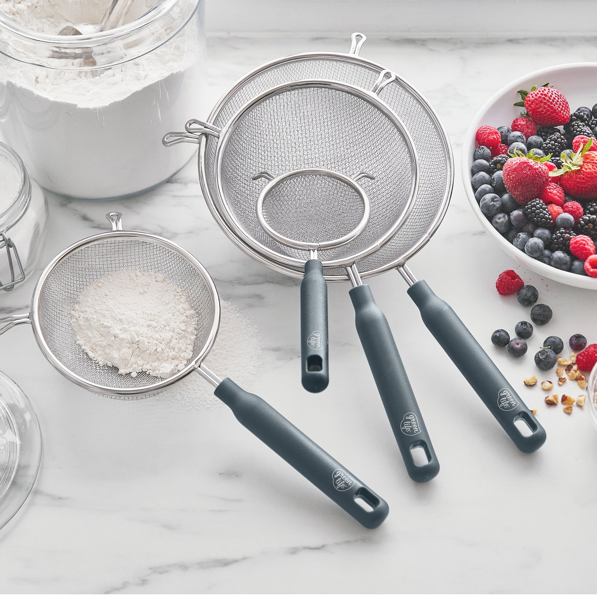 Be the first to review “GreenLife Stainless Steel Mesh Strainers, Set of 4 | Gray” Cancel reply