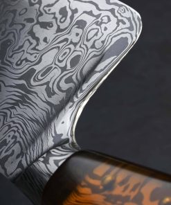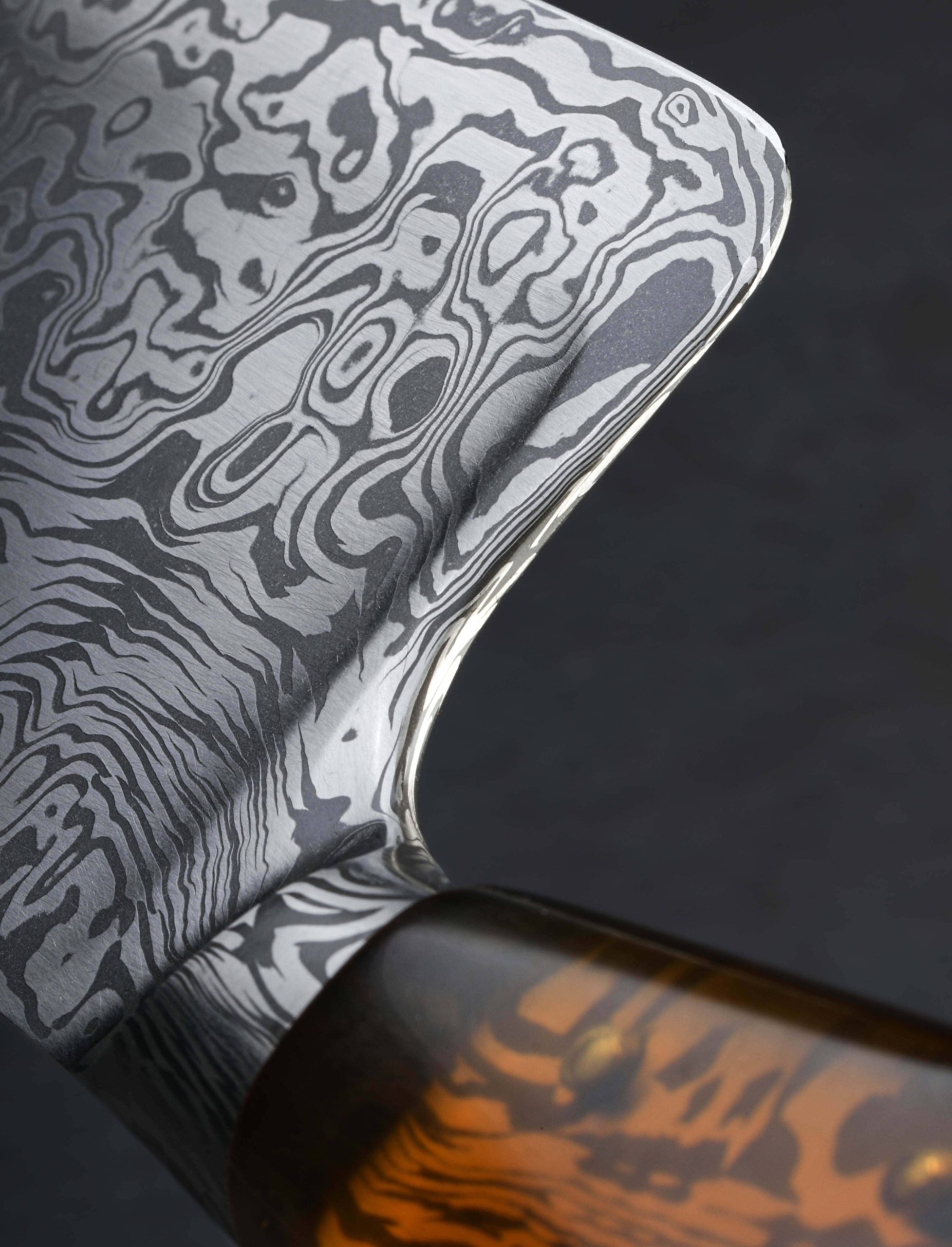 Grasp this extraordinary tool in the hand and experience a feeling as sweet as honey. The luscious sensation, though, comes not without the knowledge that the sting of the bee that makes the honey can be waiting just around the corner. With the same patience and respect with which the beekeeper cares for their bees, artist and bladesmith Joshua Prince nurtures the steel and honey-like Ultem which become at once both razor-sharp tool, and sculptural art. At his studio in Rhode Island, the build begins with Joshua forging a single piece of skewed, checkerboard pattern stainless damascus stee of his designl to form the blade, integral bolster, and tang of this chef’s knife. In AEB-L and 154CPM high-performance stainless alloys merged to form the damascus, Joshua’s exploration of the possibilities in this elusive material (i.e. stainless steel damascus), continue. To squeeze every drop of utility from the striking material, Joshua hones bevel geometry to envy: symmetrical, compound ‘S-grind’ bevels enjoy a tall, hollow section from the spine downward to around the half-inch mark where they become convex, slimming from that point to the thin, hard, and razor-sharp edge. The blade’s spine, wide and tough, tapers steadily forward to a quite slim, needle-like tip. Versatile and balanced in every sense, this is a knife to do it all. For comfort, control, and a head-turning effect that allows the tang’s damascus pattern to be viewed through the honey-inspired handle scales, the translucent material forms a grip, together with the heirloom fit integral bolster, that is both rewardingly tactile and ergonomic. A series of stainless steel pins secure the food-grade thermoplastic to the stainless damascus to complete a work of culinary art unlike any before it.