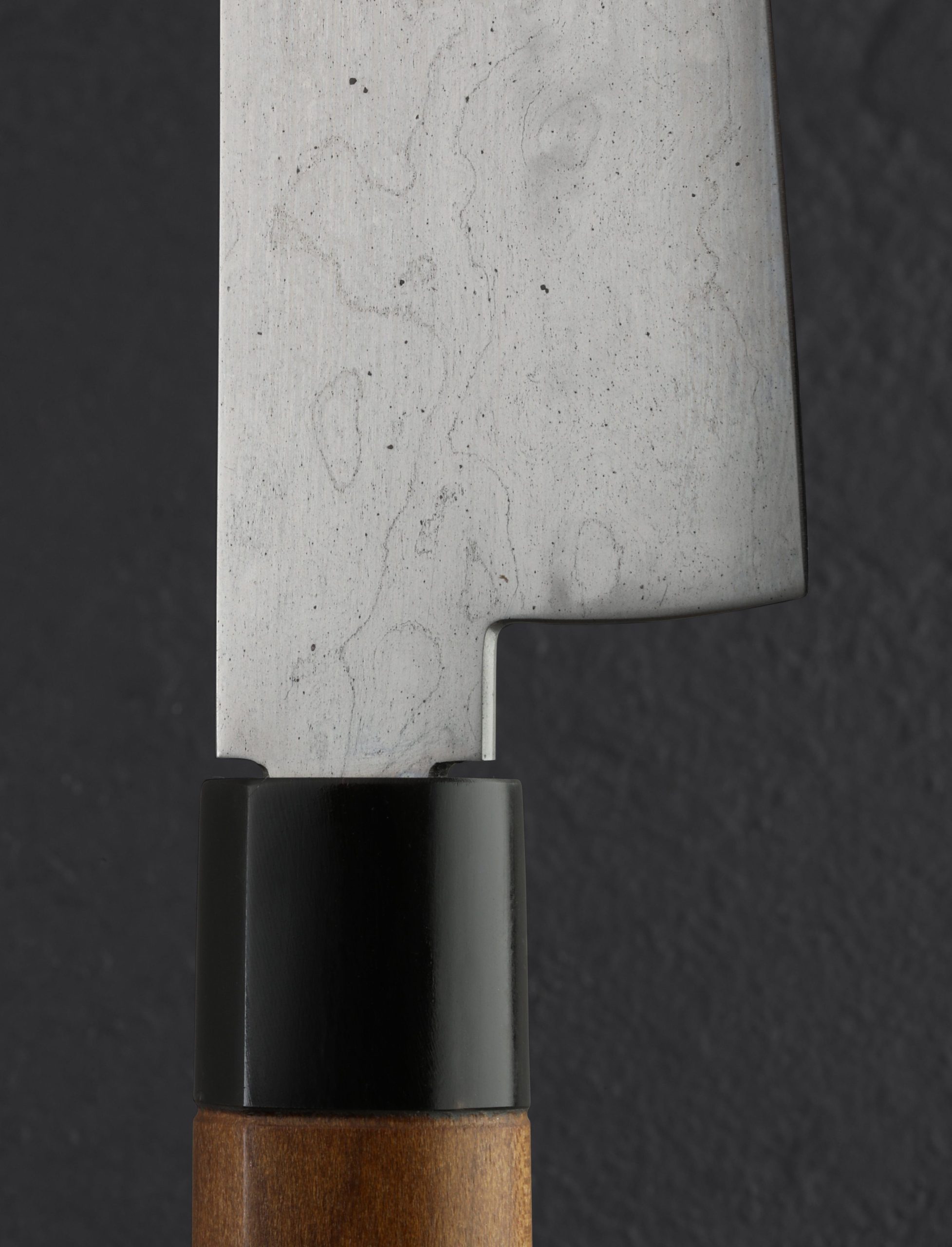 Bringing together the many elements of artist Emiliano Carrillo’s training, from ground-up steel smelting using raw ingredients and ancient techniques, to meticulous water quenching during the hardening process, and final design and assembly based on his intimate knowledge of historical reproductions, is this 181mm / 7.1″ gyuto in house-made tamahagane steel. The process began with Emiliano collecting black sand iron, a form of magnetite, from the earth, combining it with heat and charcoal in a large furnace made of clay, peat moss, and sand, and using the resulting tamahagane steel to forge the blade. Before the final blade shaping however, the steel was folded 12 times to create 12,288 total layers, a process which helps remove impurities and homogenize the carbon content of the raw bloom. A sharp, hard, workhorse edge below polished, symmetrical convex bevels, a sturdy, stiff, and rounded blade spine, and damascus-like visual pattern, the hallmark of this type of homemade steel, are some of the characteristics of the resulting blade. In traditional Japanese style, the handle, in D-shape profile for right-handed chefs, is carved from honoki, a straight grain magnolia from Japan often used to mount swords, with a ferrule of buffalo horn. Were the handle to be removed for maintenance in the future, the artist’s marks would be revealed on the blade’s tang.