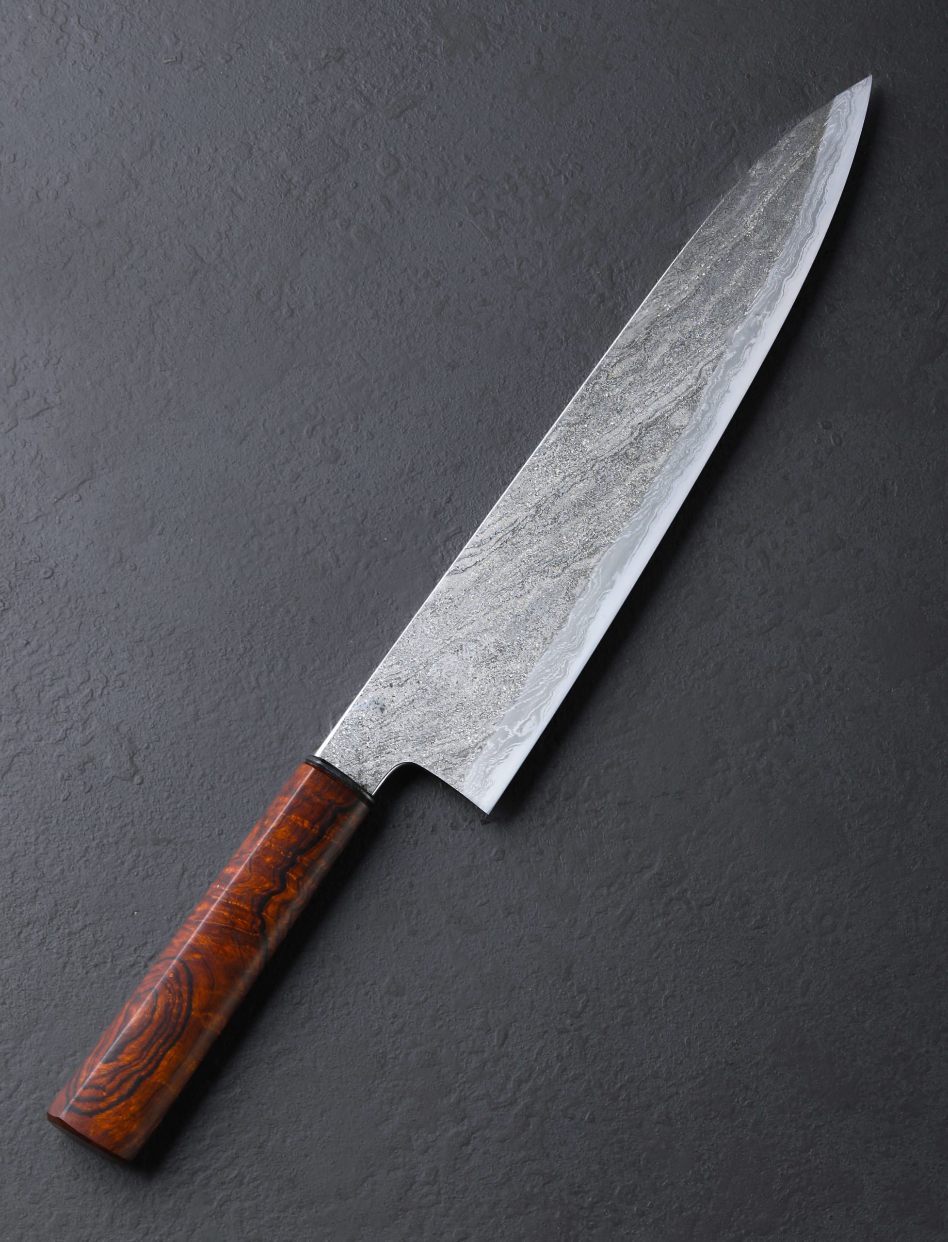 Polished by hand using Japanese natural stone from Nakayama, the highest grade finishing stone available, are exquisite primary blade bevels that slim downward to a razor-sharp, thin, and hard edge shaped for cutting performance of the highest caliber. By bladesmith Milan Gravier, the one-of-a-kind Ironwood Twist Gyuto is the kind of knife chef’s dream about the world over. Crafted at his studio in the south of France, Milan forges the blade from a house-made san mai formula that sees twisted damascus cladding atop a core of the 135Cr3 high-carbon steel which forms the 261mm / 10.3″ cutting edge. A deep etch followed by additional hand polishing gives the blade’s flats an exquisite, low-contrast finish with highlights that shine brightly as light reflects off the nickel-rich components. Balancing less than one inch in front of the 53mm-tall heel, this large chef’s tool moves nimbly and naturally in the hand, its 8.4oz / 237g overall weight distributed wonderfully. The rounded blade spine’s full-distal taper produces a versatile and hardworking finished product that is tough and durable in the rear, and becoming progressively slimmer toward the glass-thin tip. A touch of lateral flexibility is present in the forward half. To wield the work of culinary art with comfort and control is a shield profile wa-style handle sculpted from a head-turning piece of ironwood burl and fitted with a darkened, beveled stainless steel ferrule.