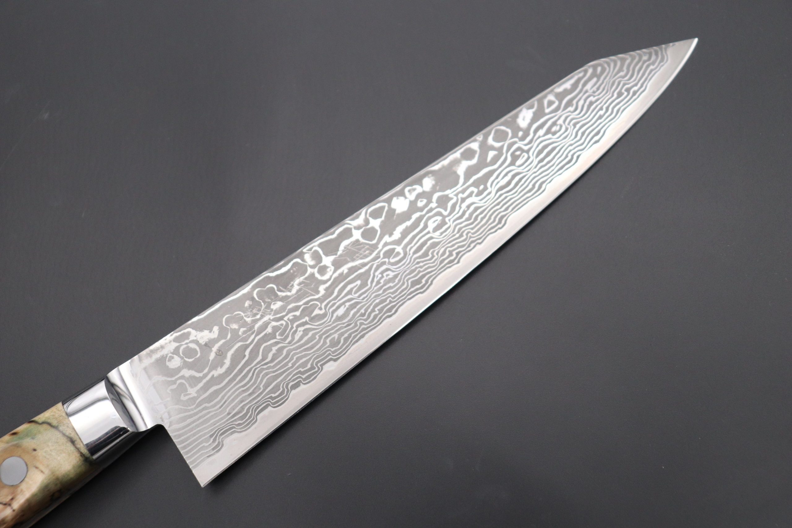 KAGAYAKI NOVEL R-2 Custom Damascus KNLTD-83 Kiritsuke-Gyuto 210mm Knife comes with a Beautiful Natural Wood Grain texture, Custom Handmade Stabilized Spalted Wood handle that is carefully hand countered and polished to ensure a comfortable&secure grip and beautiful appearance. Each knife is supplied with a matching wooden Saya (Sheath), which has been finished with a decorative black lacquer that complements the appearance of the Dark Damascus blade very well., that is carefully hand countered and polished to ensure a comfortable&secure grip and beautiful appearance. Each knife is supplied with a matching wooden Saya (Sheath), which has been finished with a decorative black lacquer that complements the appearance of the Dark Damascus blade very well.