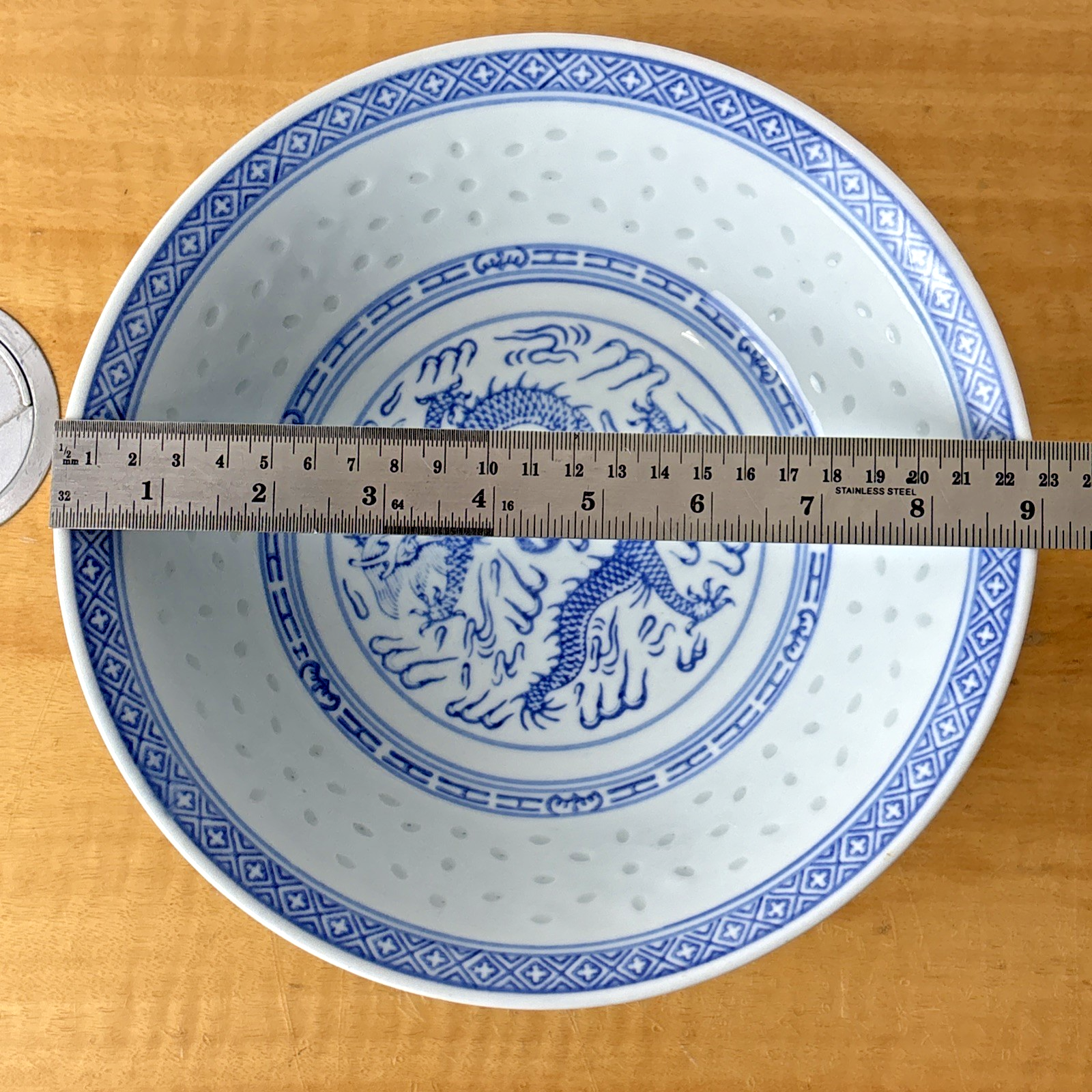 JingDeZhen ~ Chinese Rice Eye Dragon Pattern Blue & White Serving Bowl 9″ inch