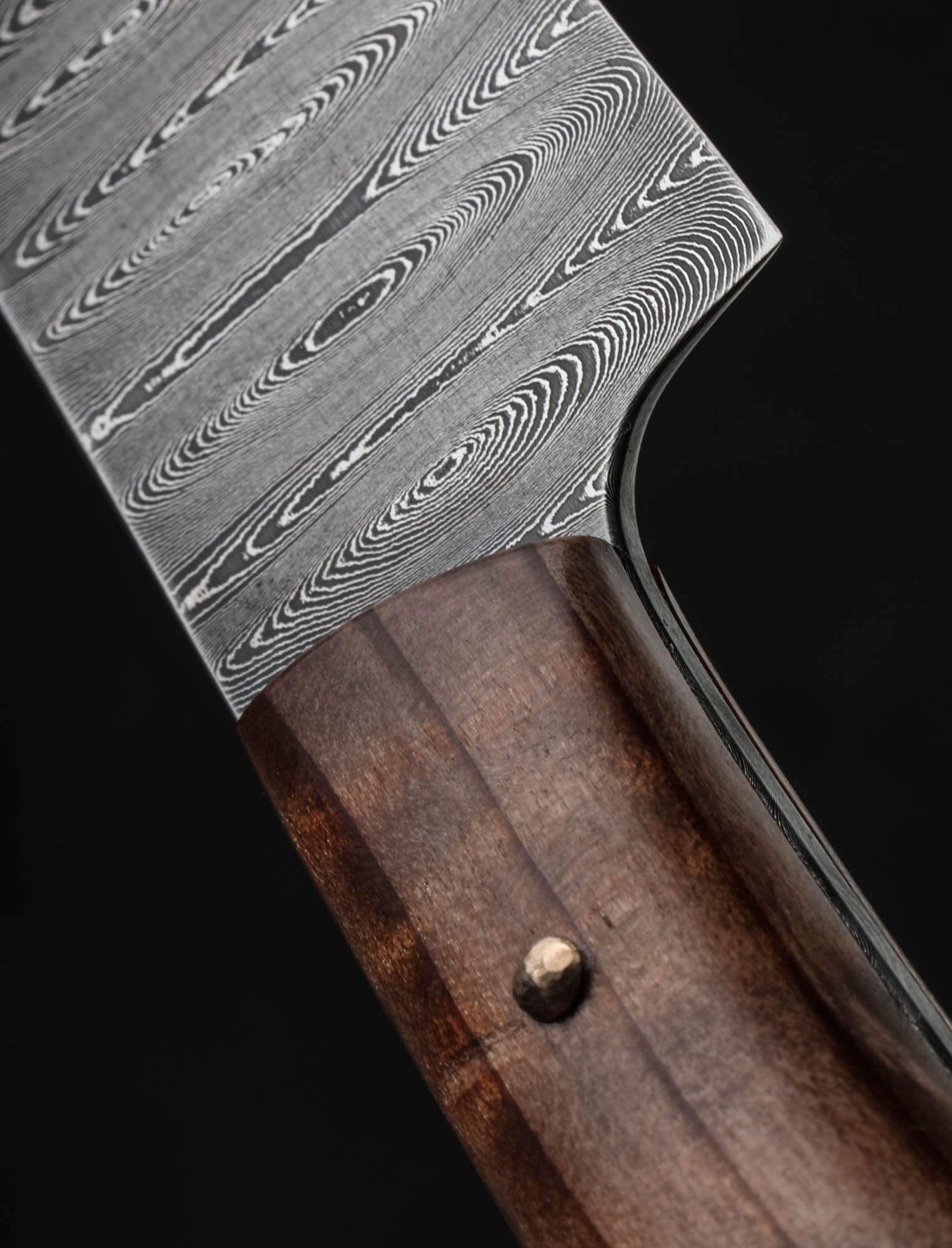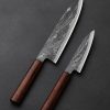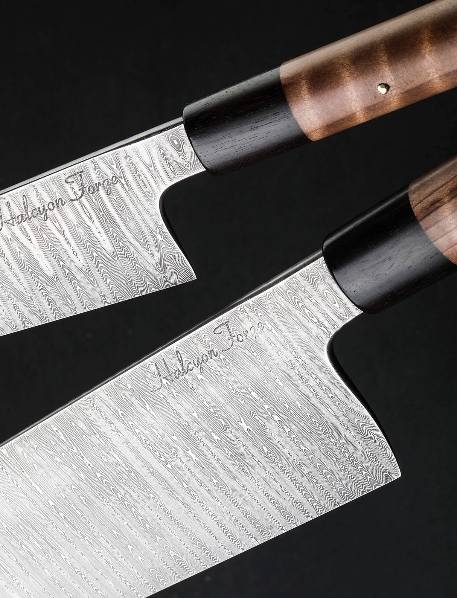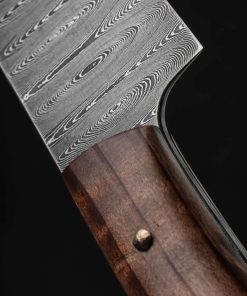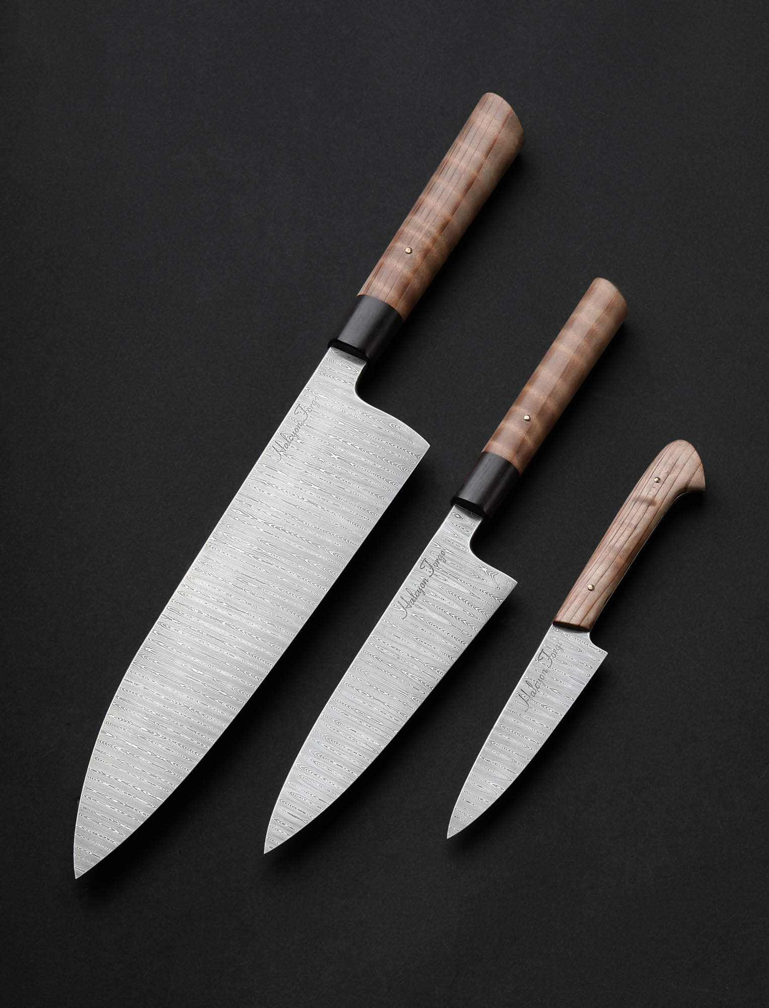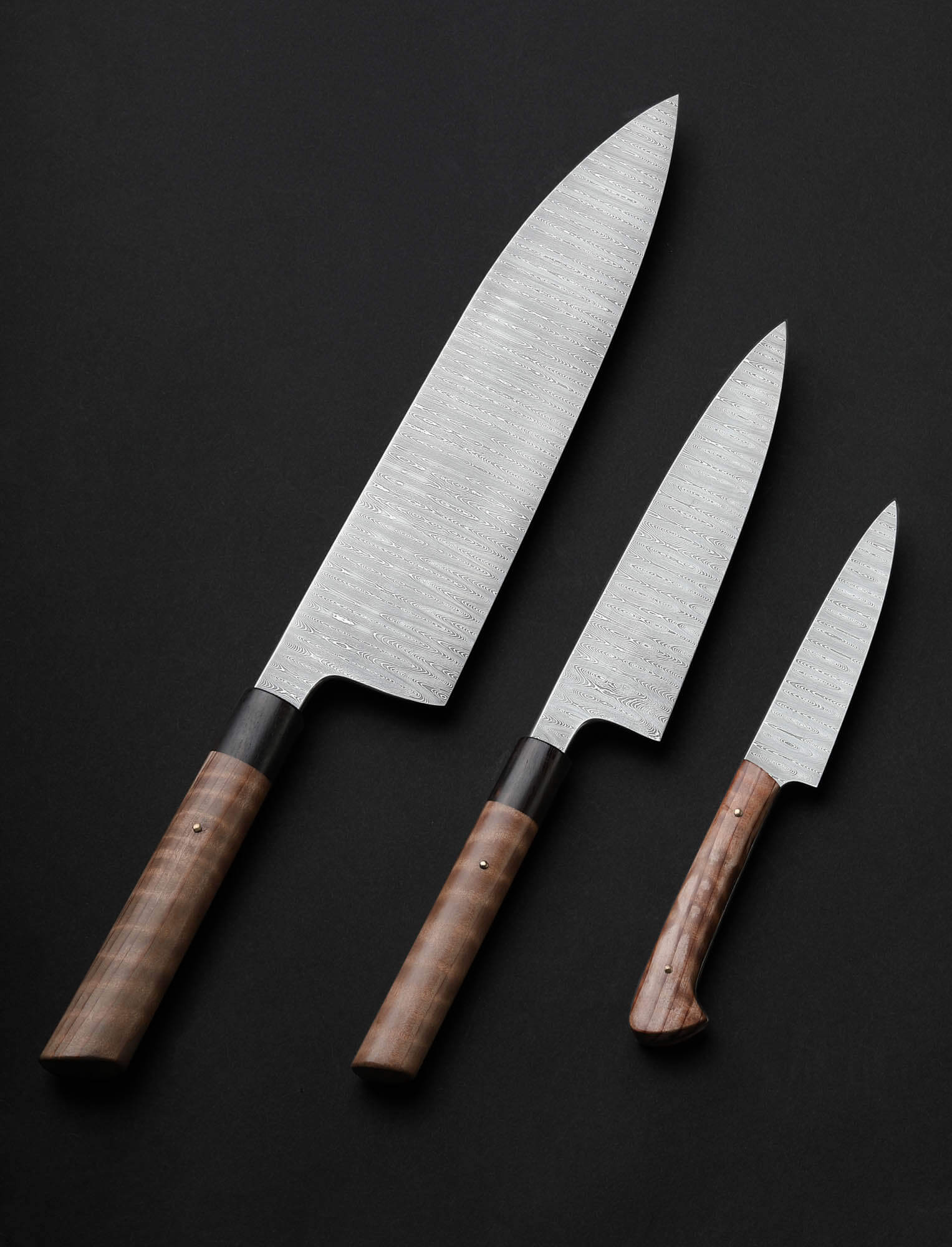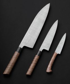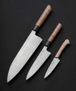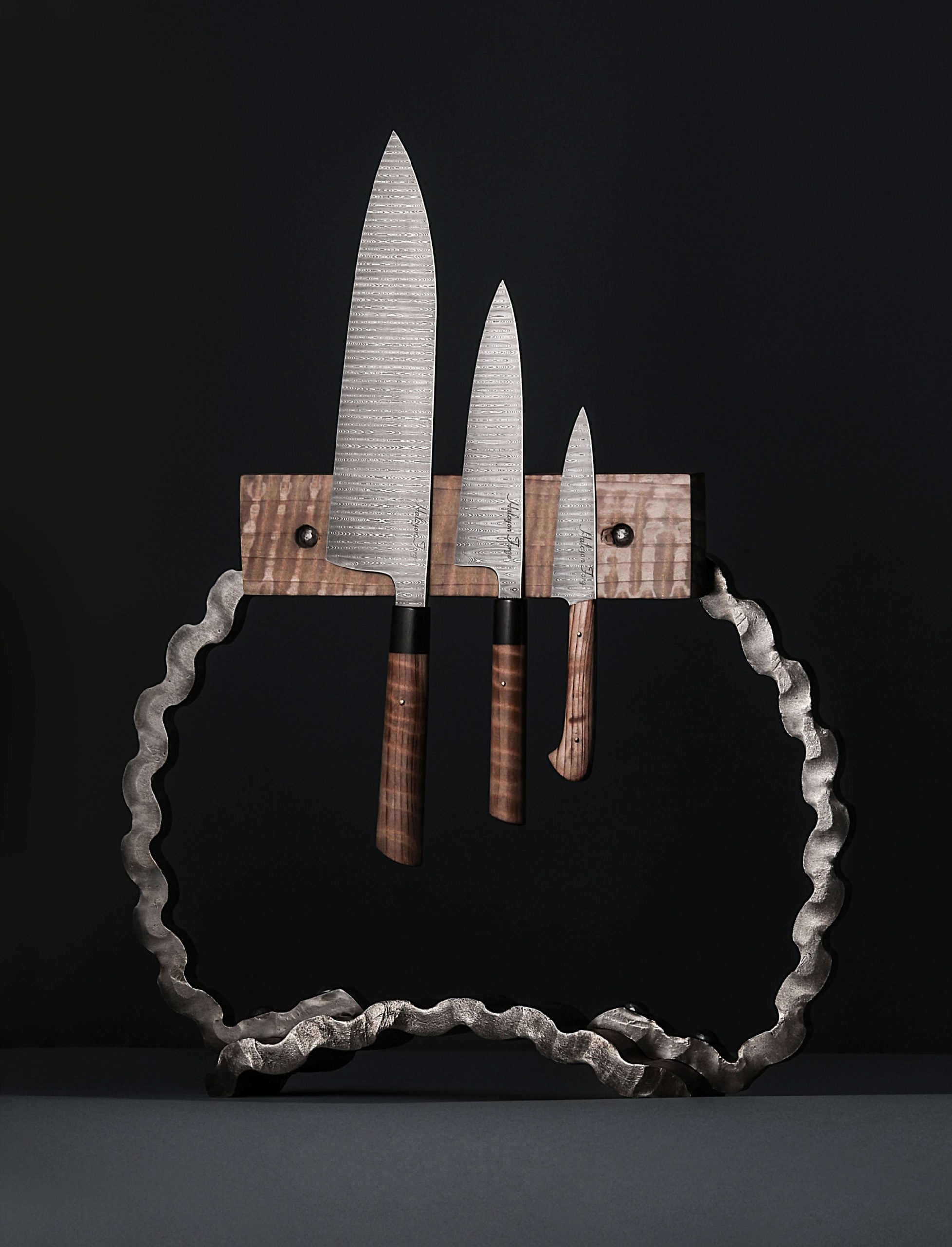 Missouri artist Joseph Schrum’s contribution to The Art of Cutlery, a three-knife chef set named “Joseph’s Ladder,” on show during summer 2024 in Tribeca, NYC, features a chef, petty, and paring knife in timeless, homemade ladder pattern damascus. Joseph’s function-first approach and reliance on clean, classic designs is on full display in a trio of blades forged by hand from as beautiful a rendition of this damascus pattern as can be found. Curly California Redwood, African Blackwood, and bronze form wa-style, hidden-tang handles on the chef and petty, while redwood alone dresses the full-tang parer. For display and countertop storage, Joseph crafts a magnetic stand from stainless steel, mild steel, and Curly California Redwood. Each blade is hardened, razor-sharp, and ready to cook with.