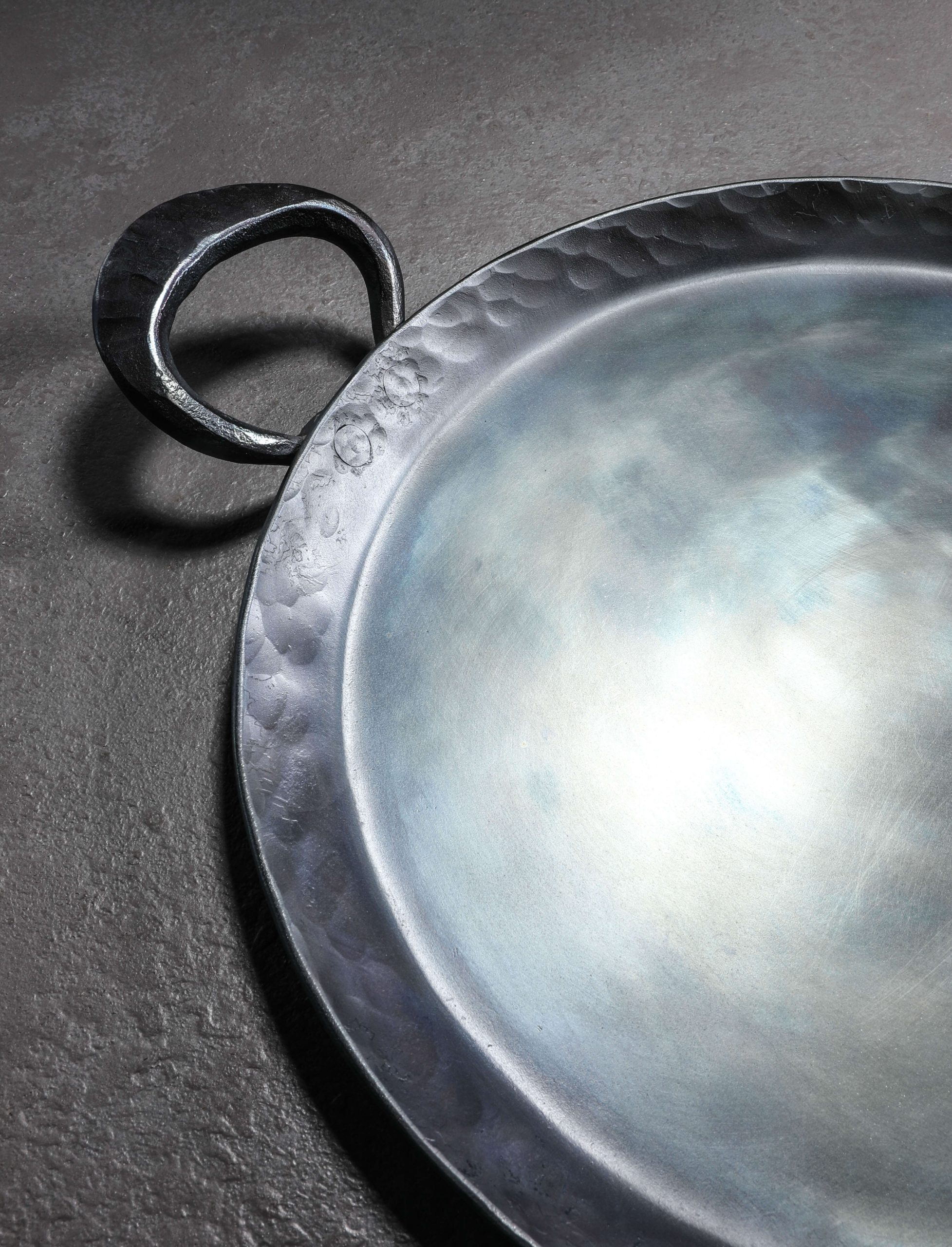 Sibling to Dennis Kehoe’s Long Handle Crepe Pan, this versatile build features two, forged loop handles for a smaller overall footprint that makes it ideal for cooking in tight spaces, for using in the oven, and atop the grill. With its large, thick, 10-gauge carbon steel cooking surface measuring a full 10″ across, this talented artisan-blacksmith’s new Crepe Pan is a beautiful, versatile, heirloom cooking tool. Handmade at his Los Osos, California studio, each pan is forged by hand and comes pre-seasoned with coconut oil. Especially thick at 0.125″, the 10-gauge material distributes and retains heat beautifully for a premium cooking experience. Carbon steel performs with all heat sources, from gas, electric, induction, and glass cooktops, to inside the oven, and over the open flame. Crepes (or pancakes or smash burgers or bacon or…….) never looked this good.