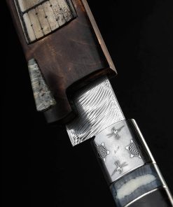 Swedish artist Tobbe Lundström‘s contribution to The Art of Cutlery, a slicing knife named “Klyfta,” on show during summer 2024 in Tribeca, NYC, pairs Tobbe’s iconic Scandinavian style chef’s slicing knife crafted in locally sourced materials with a one-of-a-kind, presentation-grade saya. The knife features a blade shaped from Swedish-made stainless damascus steel and a handle whose ingredients include a mosaic damascus bolster by Sweden’s Mattias Styrefors, fossilized walrus tooth, and ancient bog oak. Constructed of the same bog oak, the saya is embellished with an intricately engraved piece of reindeer antler by Swedish artist Patrik Nilsson, and completed with a pin of fossilized walrus tooth. Sharp and ready to use, this work is designed for carving and serving in the dining room.