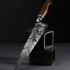 Wisconsin artist Isaiah Schroeder’s contribution to The Art of Cutlery, a chef knife named “Lantern,” on show during summer 2024 in Tribeca, NYC, spotlights Isaiah’s engineering talents and creative vision through a two-piece kitchen work: chef knife and matching magnetic wall rack. The knife’s blade is forged by hand from homemade, low-layer stainless damascus steel and finished with a high polish. In African Blackwood with forged integral damascus bolster, the handle is inlaid with a UV-activated composite in a matching pattern to the cut-outs found in the flats of the blade. Complementing both is a magnetic holder in leather atop African Blackwood inlaid with the same UV-activated composite. Built for daily cooking, the knife’s edge is hard and sharp.
