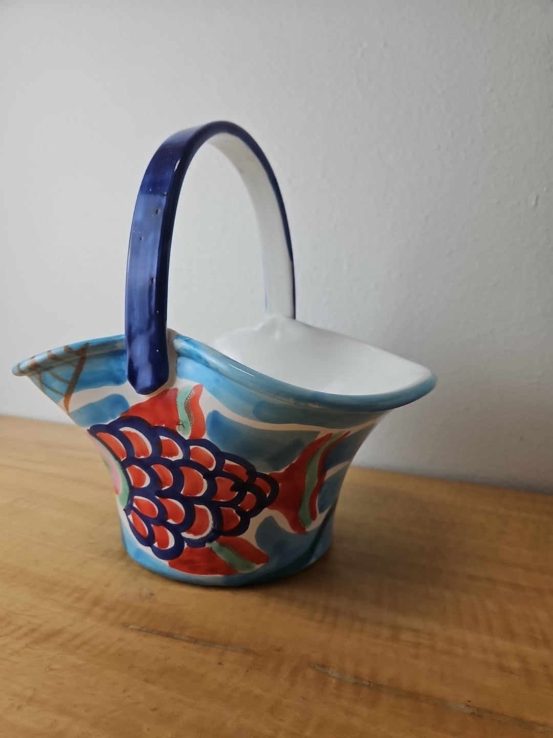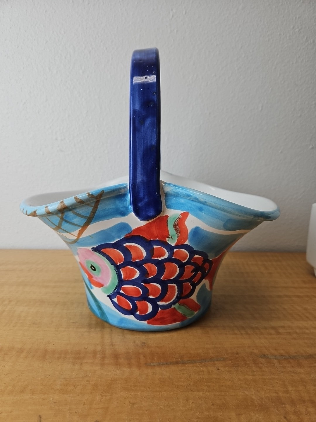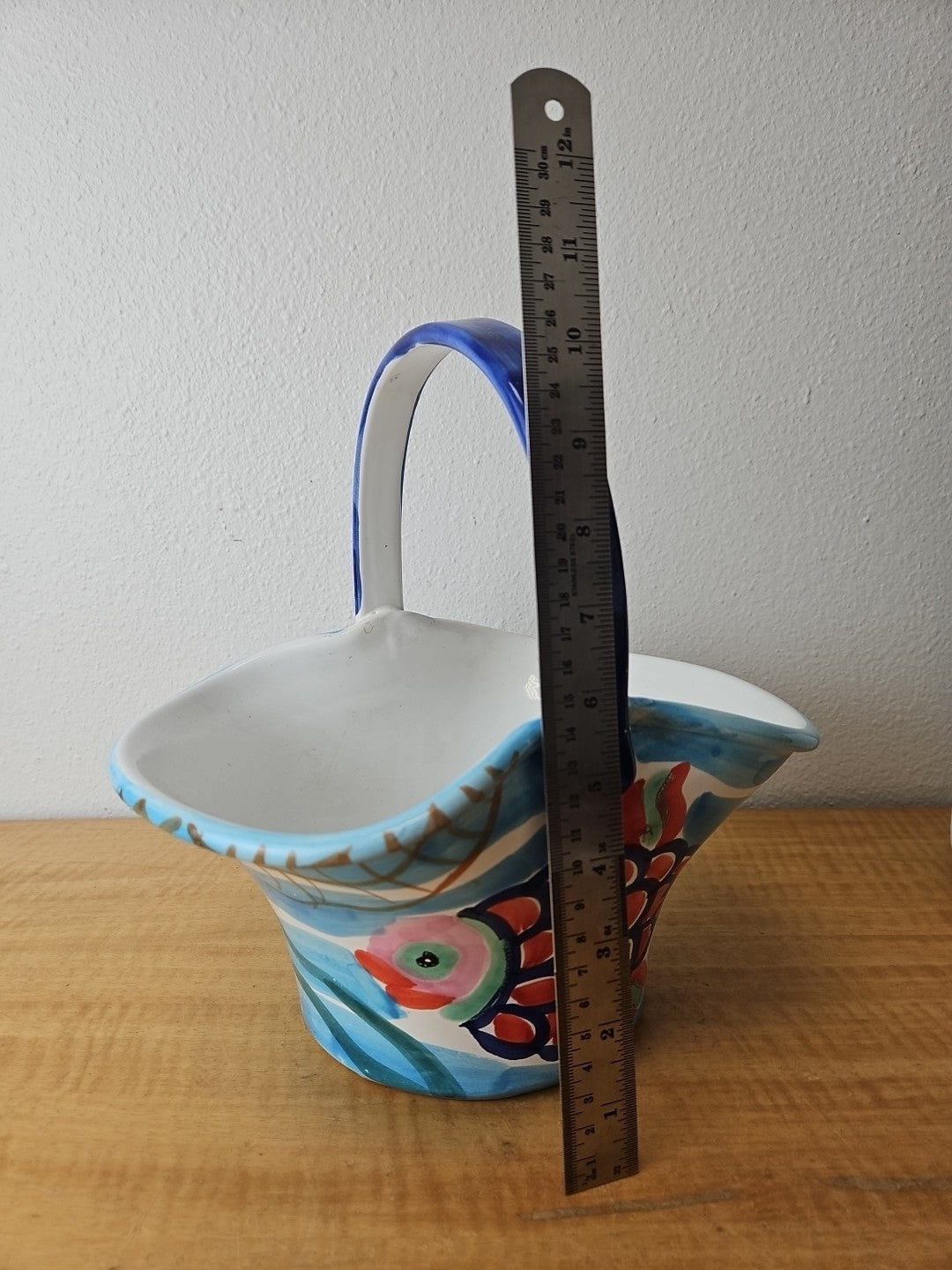 Large Ceramic hand painted Flower Basket w/ Handle Made in Italy 10 3/4″h