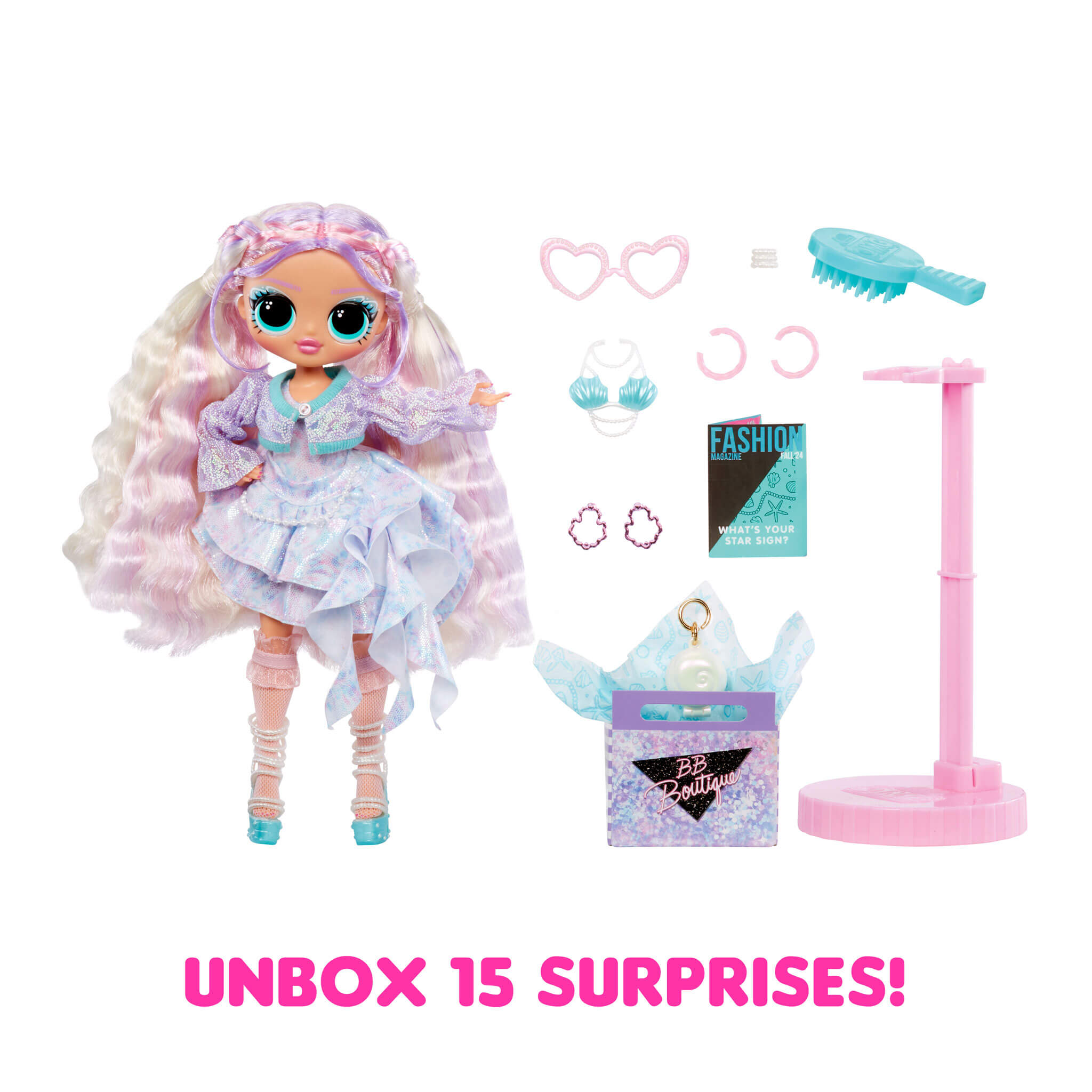 Get ready to dive into a world of fashion and pearls with the all-new LOL Surprise OMG fashion doll Pearla with 15 fabulous surprises to unbox including stylish fashions and accessories! With luscious hair like ocean waves and beautiful mermaid-inspired fashions and accessories, Pearla loves enjoying every moment of the fresh ocean breeze and cruising through the LOL Surprise world with her BFFs!