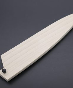 These Saya are made of Magnolia wood, which resists water and shrinkage well. Each Wooden Saya is carefully handcrafted to fit each blade and comes with a Black Pakka Wood pin, which is used to secure the blade within the wooden Saya. Many of our customers enjoy spending time together with their fine Japanese knives and fine wooden Saya.