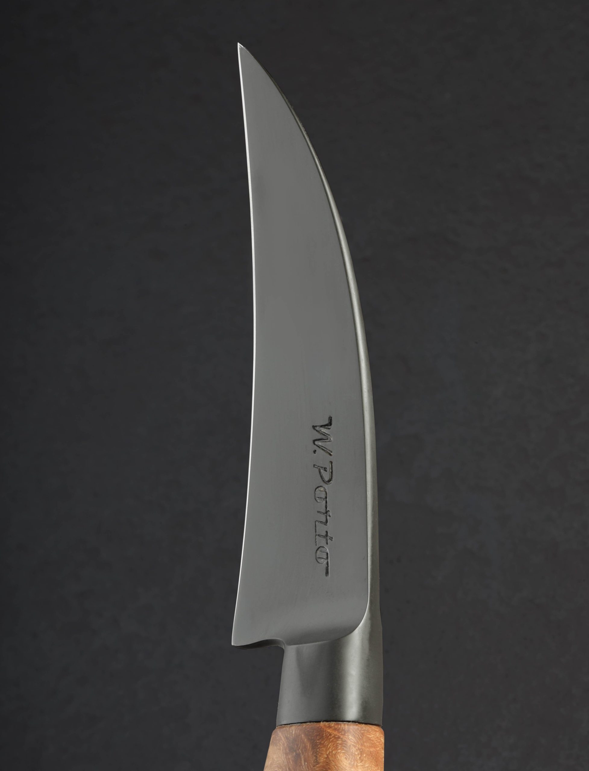 Dressed in beautiful, figured maple burl and delivered with a handmade buffalo leather saya, this William Porto bird’s beak paring knife features a long, versatile blade of 5160 carbon steel with dark, matte, phosphated finish. This finish covering both blade and integral forged handle bolster, provides added toughness and protection from the elements while maintaining the benefits of high-carbon steel. Razor-sharp beneath convex bevels, the blade is crafted to perform, perfect for handheld carving and peeling work above the board in the kitchen, and just as utile while foraging for herbs, fungi, fruit, and vegetables in the great outdoors. As expected of every piece by this talented Brazilian artist and bladesmith, the craftsmanship is superb every way, from the rounded blade spine’s distal taper to a fine, needle-like tip, to the soft, sculptural edges of the blade’s choil and bolster transition, the heirloom fit-up between steel and wood, and the rest. Comfortable and balanced in the hand, any bird’s beak parer makes a versatile and handy addition to the chef’s kitchen, and this build by Mr. Porto is outstanding in every way.