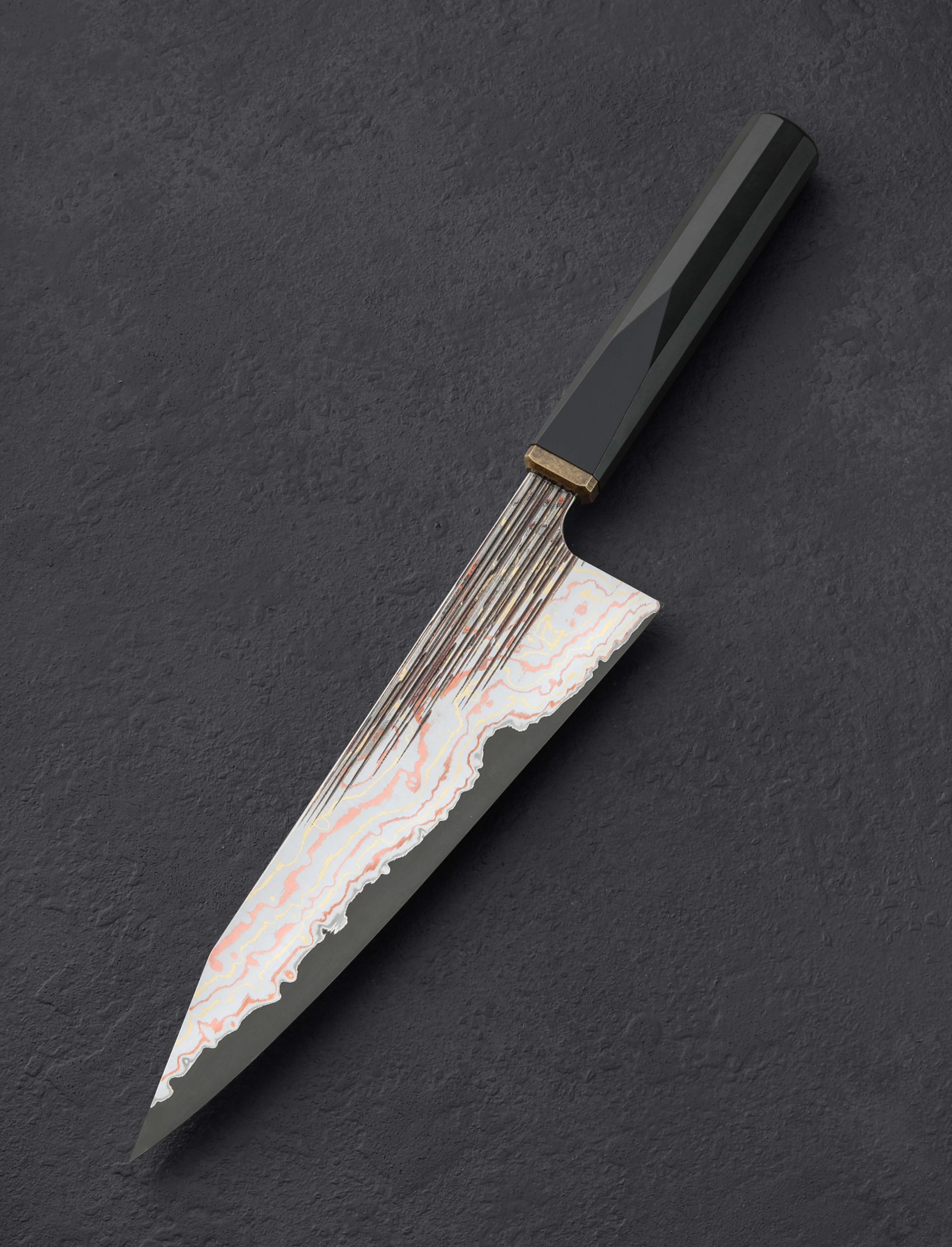 Luke Scheepers’ unique style and outstanding attention to detail, both the technical and creative, makes us look twice, and then look again. A combination of modern techniques and traditional sensibilities employed at his Australian studio results in one-of-a-kind chef knives like this one, a 221mm gyuto featuring a V-Toku2 carbon steel edge clad with jackets of Japanese-made Takefu Yu-Shoku mokume, a metallic combination of copper, brass, and stainless steel designed specifically for culinary knives. Textured along the blade’s flats with Luke’s ‘Stringy Bark’ pattern above superbly shaped convex bevels, the striking appearance is second only to the balance, geometry, and versatility of the tool. The edge is thin, razor-sharp, and hard at 62.5 HRC on the Rockwell scale, from the 55mm tall heel forward to the paper thin, needle-like tip at the end of the spine’s distal taper. Comfortable, elegant, and designed for every hand and grip style, Luke has sculpted black paper micarta into his decagonal handle shape which tapers forward before meeting a bolster of weathered brass with stepped-down, heirloom fit and beautiful contouring. Included is a unique and handsome stitched Tasmanian Oak saya.