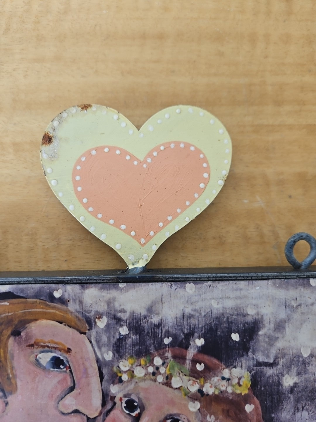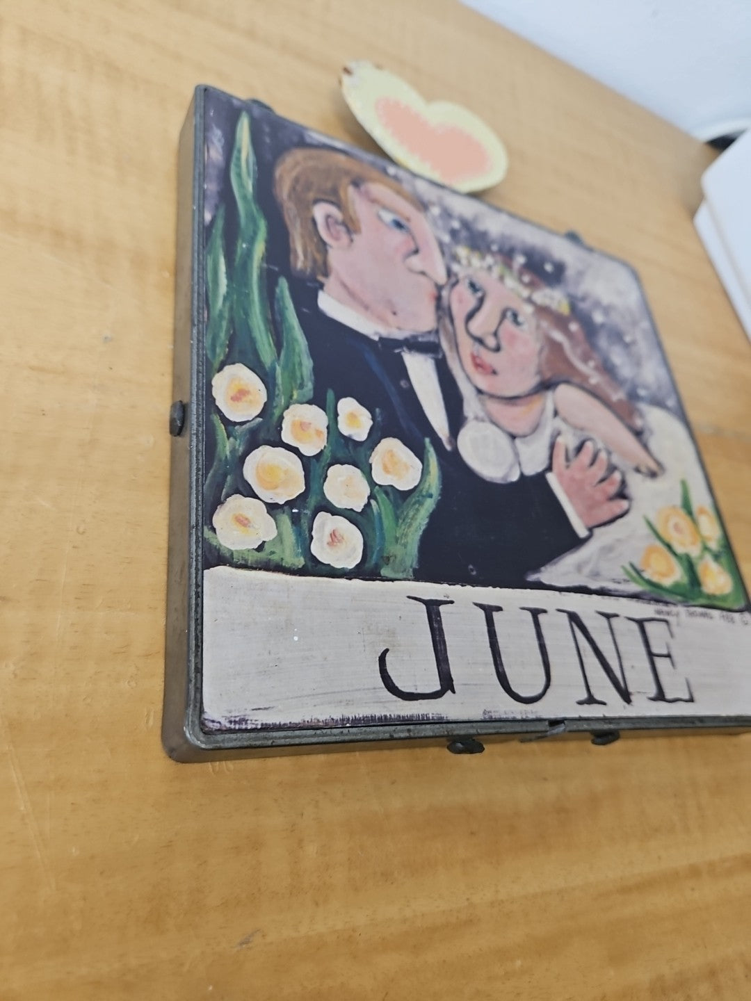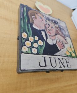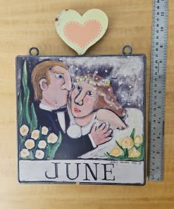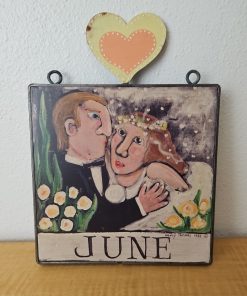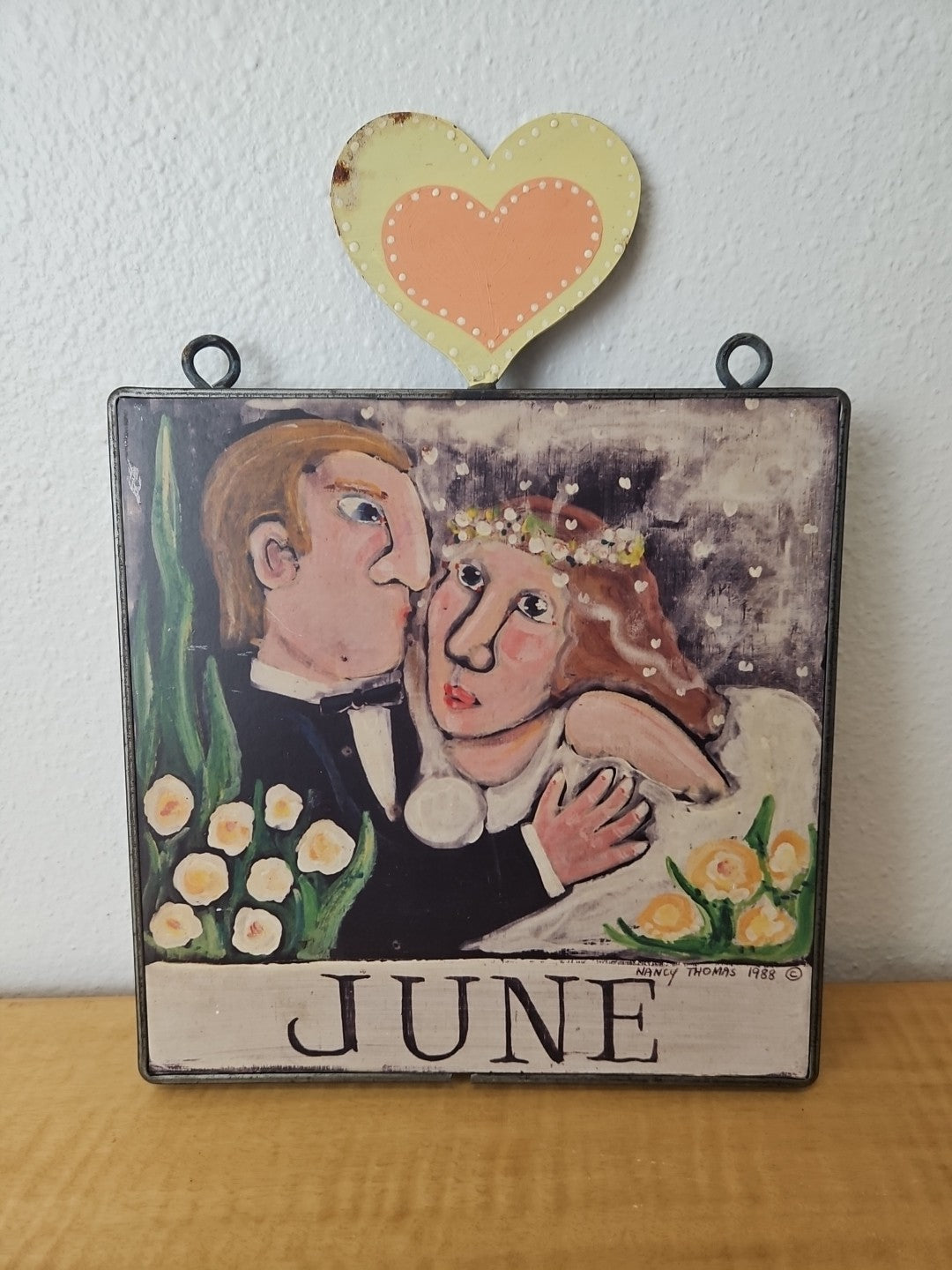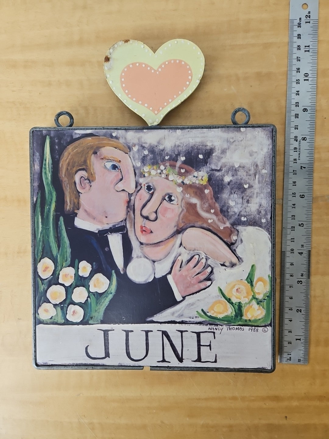 Nancy Thomas Folk Art Wall Plaque ~ JUNE wedding couple kiss hearts
