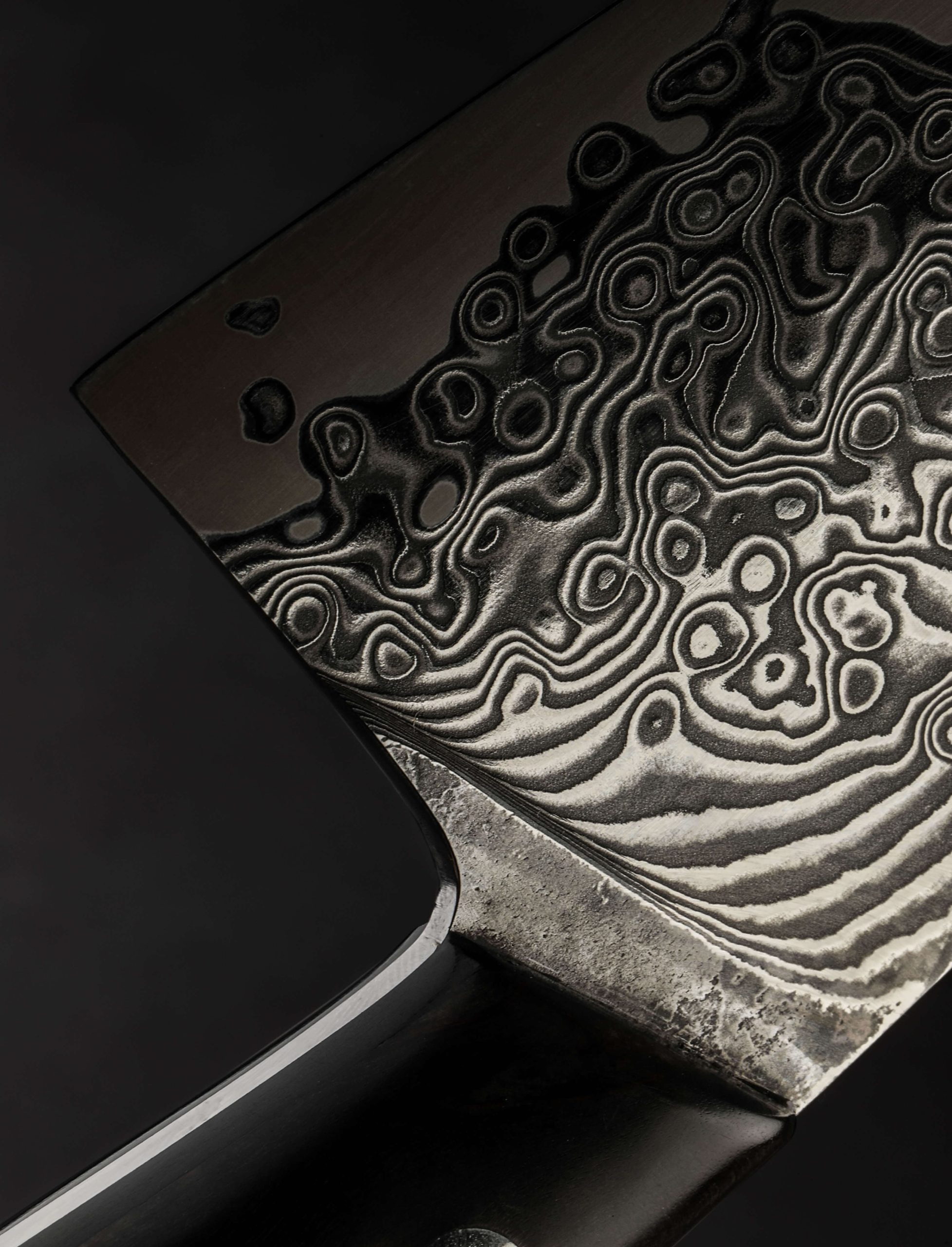 Unique by maker Fingal Ferguson’s standards, versatile and utilitarian in the kitchen, and with ‘easy on the eyes’ being an understatement, this Nickel Suminagashi Chef Knife is ready for greatness in its new home. The low-maintenance, high-function blade is tall and voluptuous in profile, shaped from a stainless nickel-damascus-clad san mai formula with a core cutting edge of high-performance SG2 powder stainless steel. Thin and sharp at the edge beneath tall bevels, and with an aggressive, pointed tip at the end of its 196mm / 7.7″ length for precision slices and detail work, the blade stands 59mm tall at the heel to easily chop through the largest ingredients in the next breath. Not seen as often from the Irish-based artisan as his hidden-tang culinary knives, Fingal’s full-tang construction for this build helps add additional weight and overall mass to the tool, providing 7.1oz / 202g of power to easily move through everything on the cutting board with minimal effort. For the handle, comfortable and ergonomic in Fingal’s recognizable form whether found on a scaled, full-tang build like this one his or hidden-tang wa style knives, are sculpted, hand-hugging pieces of curly birch wood over liners of black G10, all secured with a pair of flush, polished stainless steel pins.