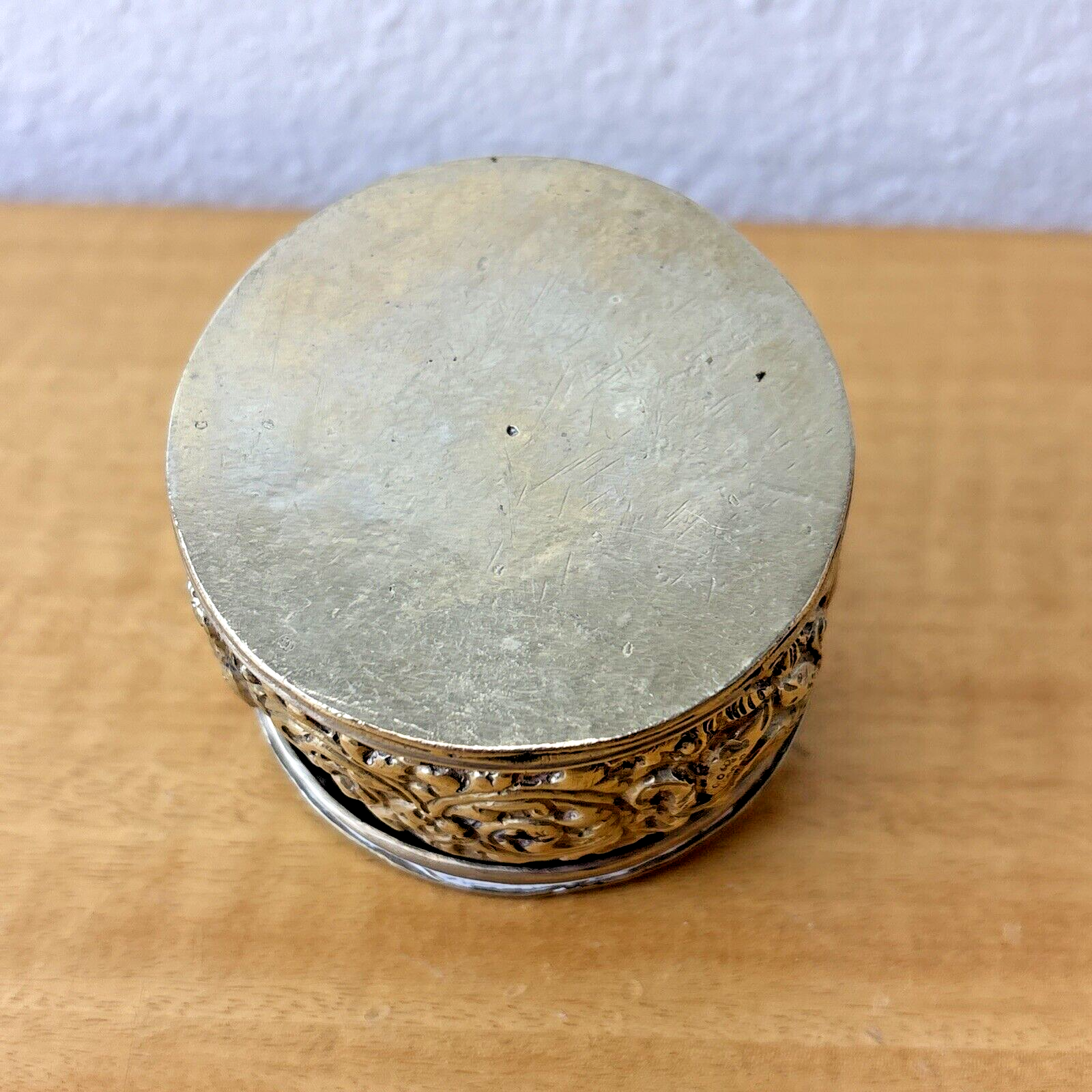 Ornate Round Silver/Gold Metal Trinket Jewelry/Pill Box Vintage With Green Rock