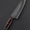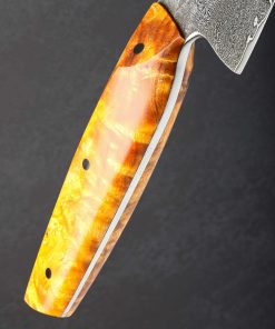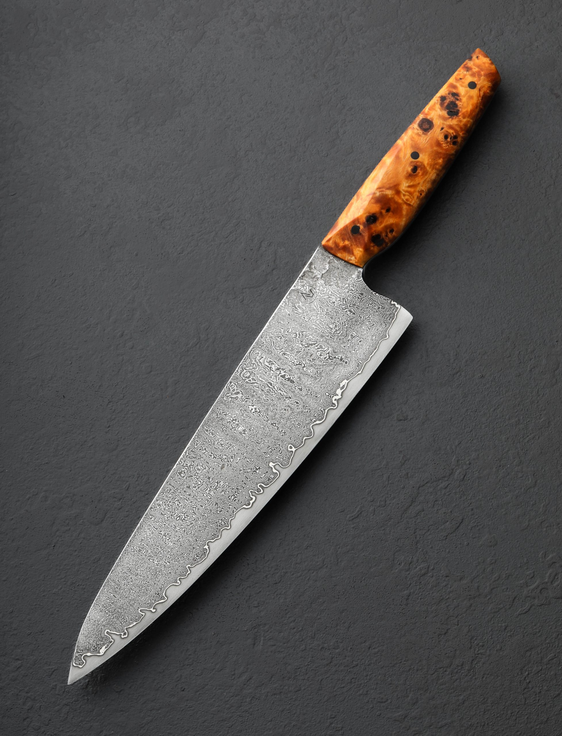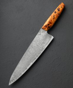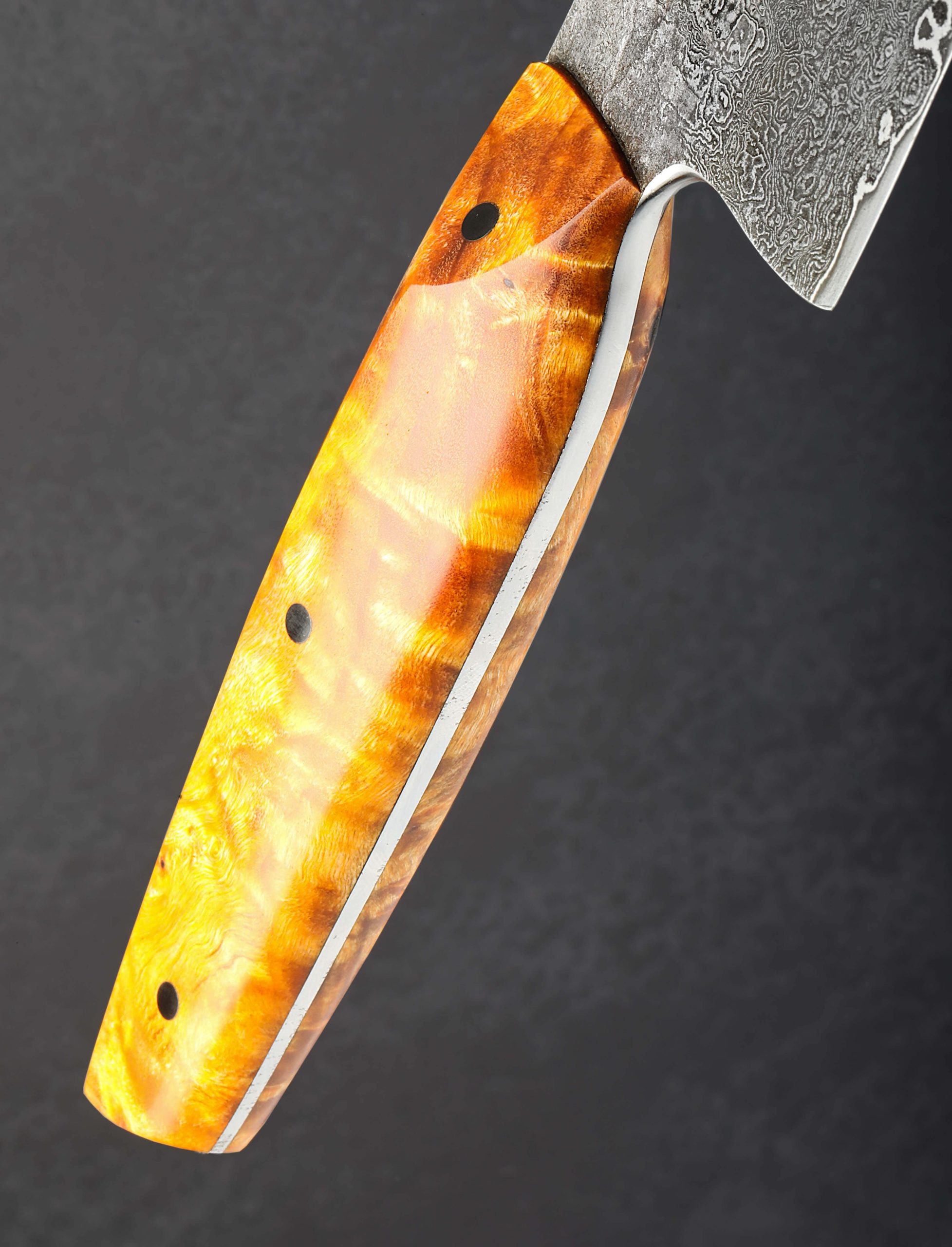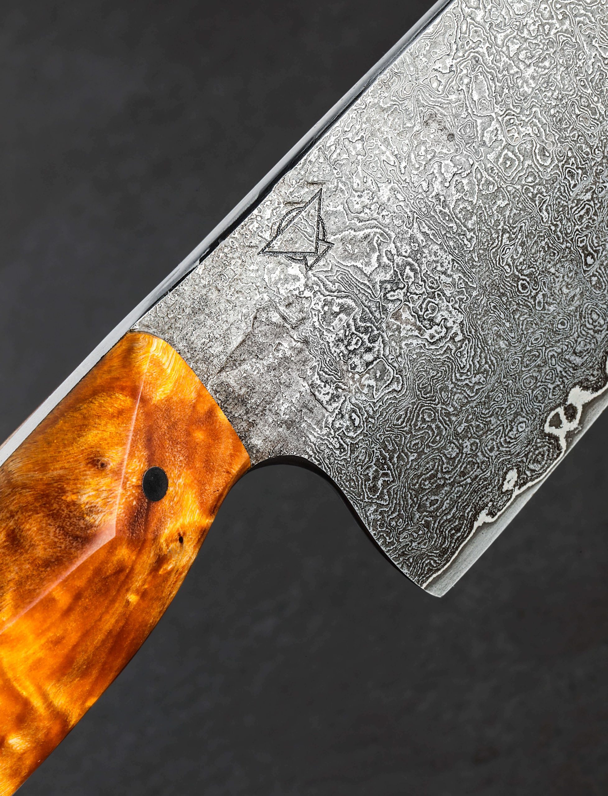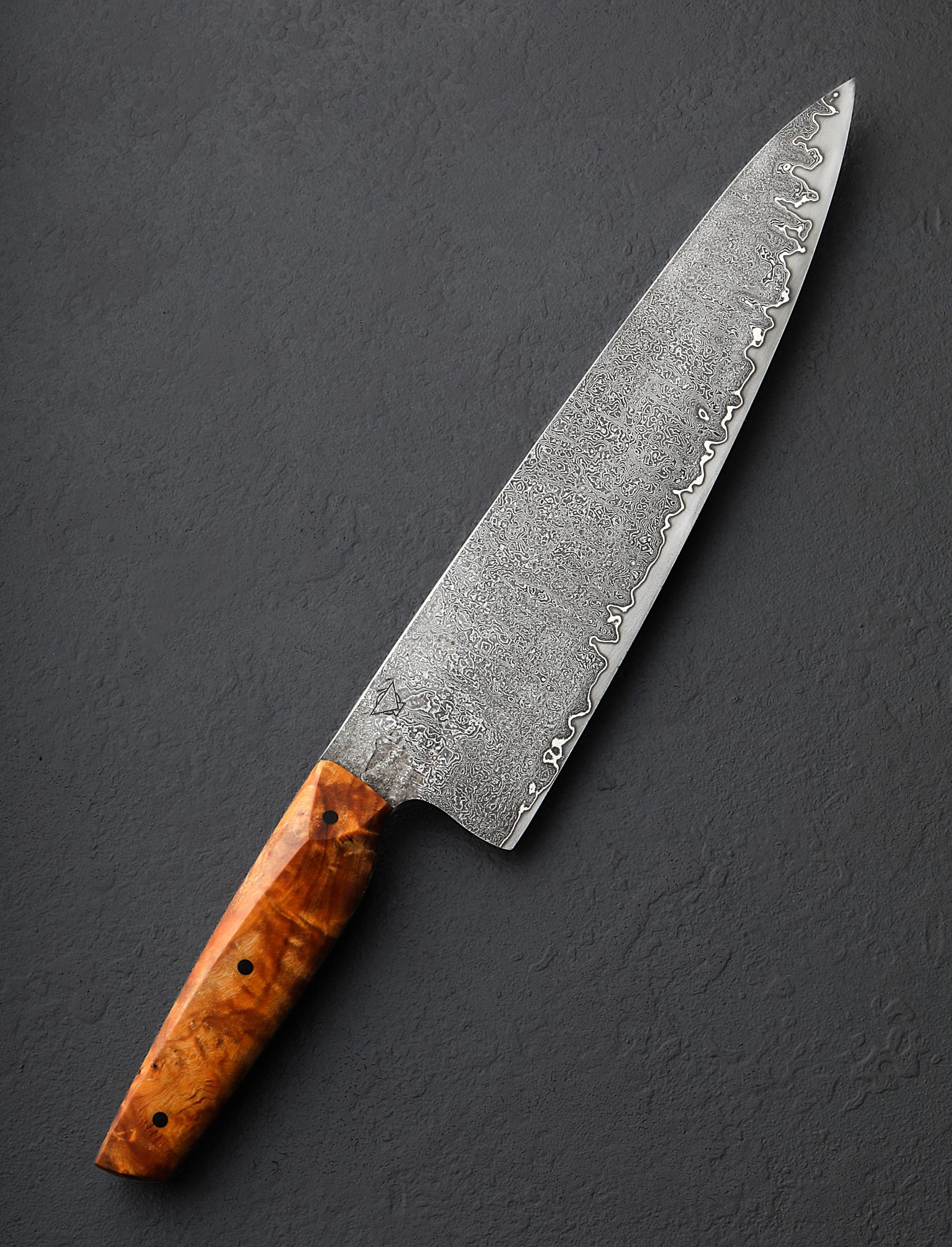Clad in striking, house-made damascus and pure nickel, this ApexUltra-core chef knife was forged by the talented and experienced hands of Austria’s Tobias Hangler. Tobias is the bladesmith and metallurgist, with a Masters in Metallurgy from Montan University, who worked to develop from the ground up the new, high-performance steel that forms the blade’s edge, and this one-of-a-kind tool is as purposefully designed as the material within it. Thin and razor sharp, the 235mm / 9.3″ edge sits below mid-high bevels that boast Tobias’ super convex geometry. The dense, random-pattern damascus transitions to the silky, satin-finished ApexUltra core through a layer of nickel that inhibits carbon diffusion out of the hard, monosteel edge during forging and heat treatment. A dynamic and versatile kitchen workhorse that balances less than an inch in front of the 57mm-tall heel delivers 9.3oz / 264g of wood and steel, imbuing power and control on the cutting board. The flush blade tang tapers backward through the handle for balance, becoming rounded and polished above a matching choil where the spine again begins to taper distally toward the tip, from 4mm, to around 2.4mm at the midpoint, to barely 1mm at the one-inch mark, and still thinner to a glass-thin, needle-like culmination perfect for detail work and precision slicing. A simply shaped, beautifully finished full-tang handle of poplar burl completes the package.
