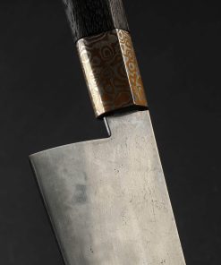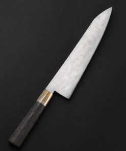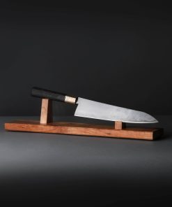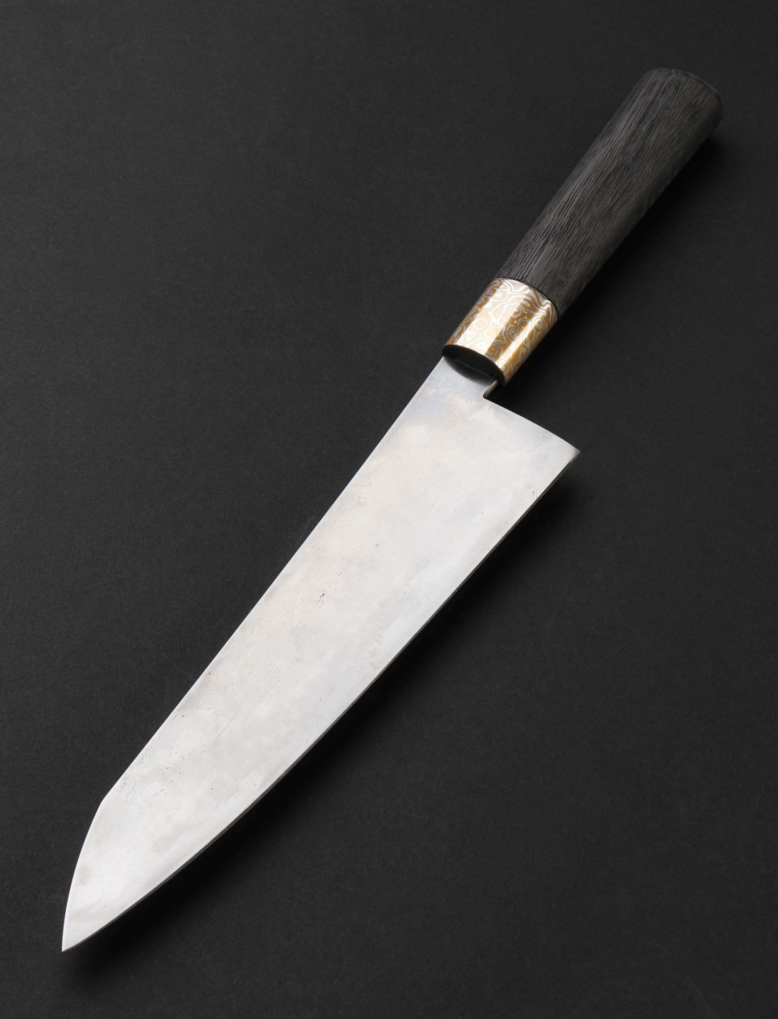 New Jersey artist Emiliano Carrillo’s contribution to The Art of Cutlery, a gyuto called “Precious Steel,” on show during summer 2024 in Tribeca, NYC, is named for the homemade tamahagane from which it is forged. This traditional approach to steel making, and in turn, this work of functional art, receive their moniker from two Japanese words: tama, meaning ‘precious’ and ‘hagane’ meaning steel. Emiliano, who has long studied traditional blacksmithing and tool-making techniques, first collects sand from a particular beach in Connecticut, isolating the raw iron ore using a magnet. He then fashions a one-time-use-only bloomery furnace from clay, mud, and peat to combine the iron with carbon under high heat to form raw steel. The raw steel, or bloom, is then forged and folded by hand repeatedly, forming the bar of steel which is then shaped into the finished blade. The D-shaped wa handle, configured for right-handed users, is sculpted from ancient bog oak and finished with a mokume gane bolster made from sterling silver and copper. A wooden display stand is included, as well as small amounts of both the iron ore sand and resulting raw bloom. This knife is razor-sharp and built to cook with.