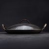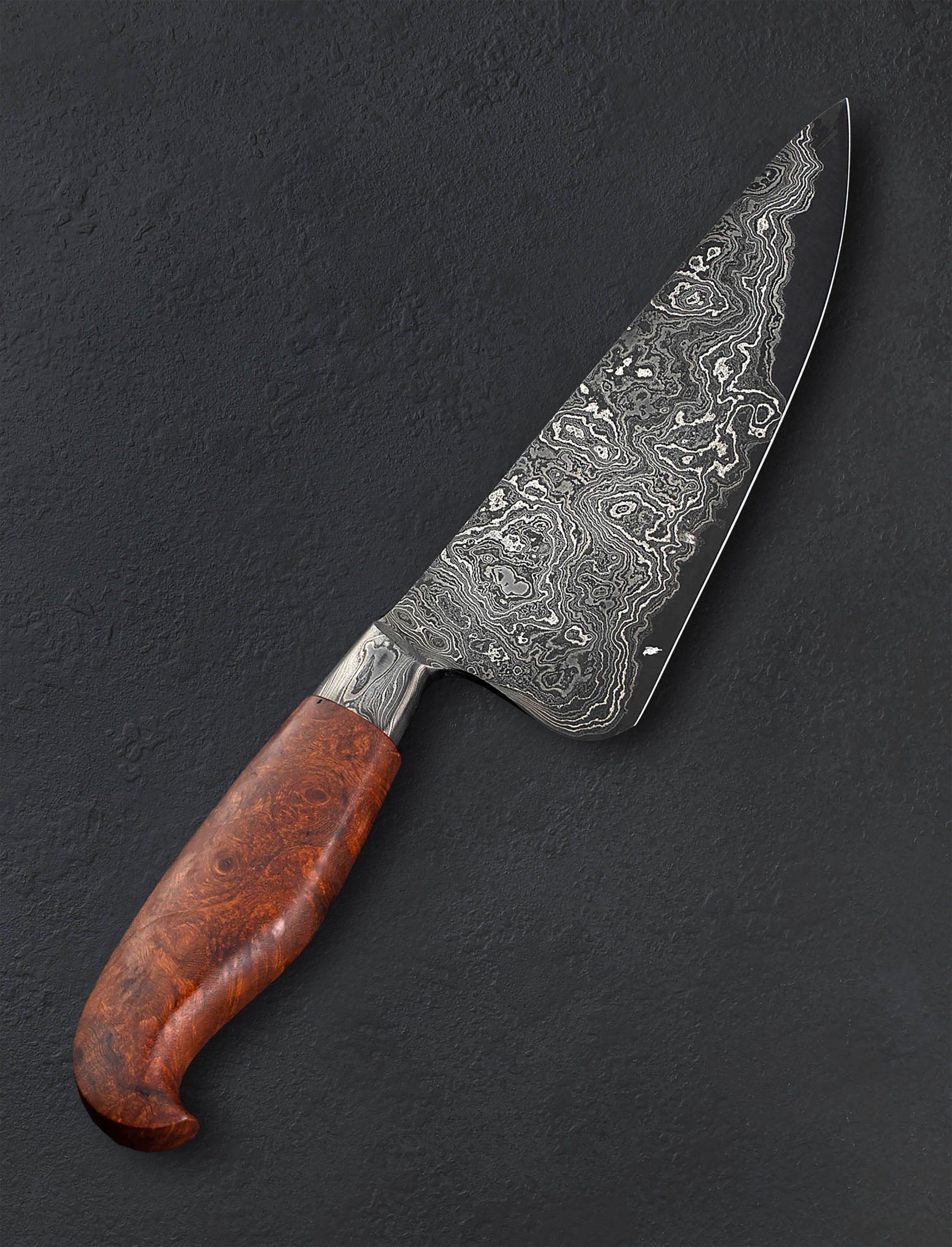 You’ll find no marks on the knife to indicate who its creator is, yet you’ll not soon forget the work of bladesmith Joshua Prince. In unused, like-new condition, this pre-owned chef knife was crafted in Joshua’s Rhode Island studio and features a 190mm / 7.5″ long by 68mm tall blade with gorgeous cladding formed from layer upon layer of wrought iron, mild steels, carbon alloys, and pure nickel. The cutting edge, thin, hard, and razor-sharp, is shaped from 80crv2, a high-carbon chrome-vanadium steel known for its toughness, making it an excellent workhorse material in the kitchen. This core steel is visible as a dark center-line running the length of the blade’s rounded spine, but it is evident more than anywhere as the blade steel fans out into the integral bolster, which marks the balance point of the knife, and for which Joshua has provided a stepped-down, heirloom fit as it meets the ironwood handle. Carved into a crook-handle shape that fills the hand comfortably and naturally, the ironwood is a fitting completion to this stunning, one-of-a-kind tool.