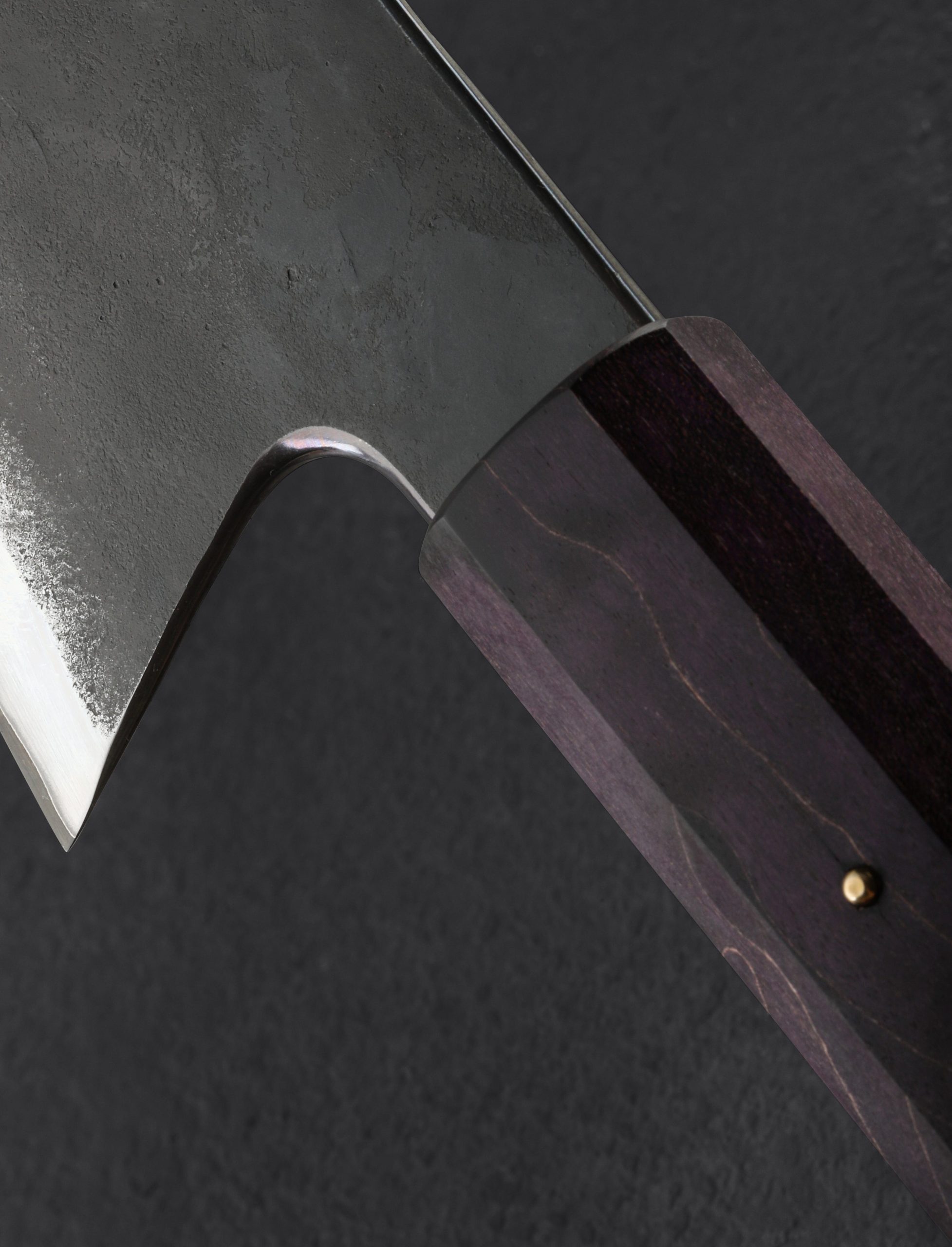 A beast of a gyuto by Australian bladesmith James Oatley, dressed in purple, ready to dominate the kitchen with power and grace. Tough, short, subtly convex bevels of stainless-clad san mai with a hard, thin, razor-sharp edge of V-Toku2 carbon steel provide the workhorse durability balanced with precise and refined geometry to tackle every cut, from the most demanding to the most detailed. A slim, near-zero edge and fine, pointed tip combined with the knife’s weight and forward-leaning balance will help this blade perform a bit like a double-bevel deba, with a tall heel and gyuto-leaning edge profile suited to chopping jobs at the same time. Dark, forged-finished flats show each purposefully placed hammer mark imprinted by James at his studio in Sydney, while the bevels receive a silky, hand-sanded, high-polished finish for cutting performance. Nicely rounded at the spine and choil, together with a robust, octagonal wa-style handle in purple-dyed and stabilized maple wood, offer comfort and control in any grip. Domed and hand-peened, a single bronze pin allows for handle removal in the case that maintenance is needed.