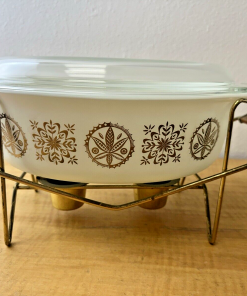 Pyrex 2.5qt Hex Signs Pattern White-Gold Dish With Lid & Candle Warmer Cradle