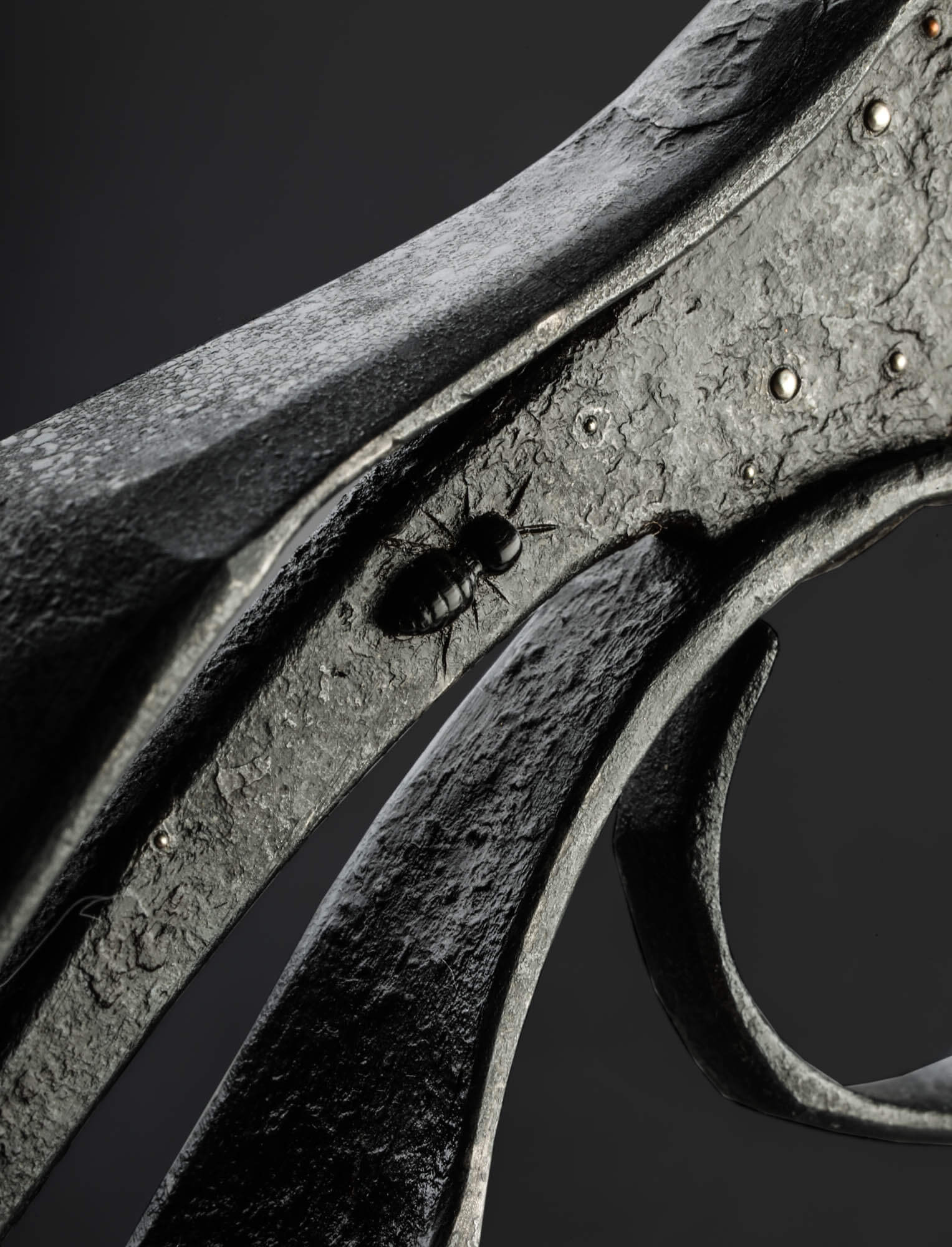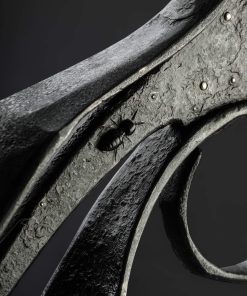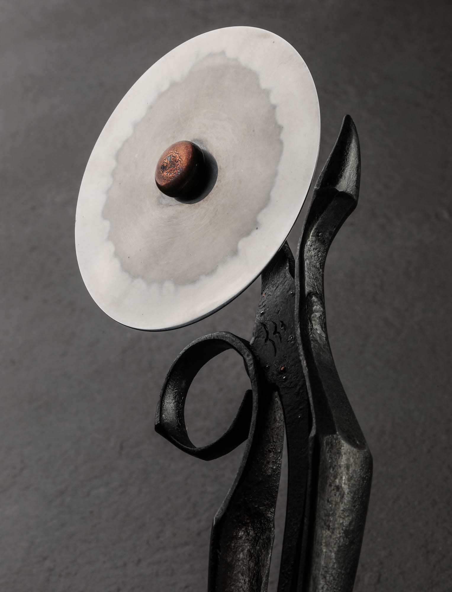 Romanian artist Toma Fenes’s contribution to The Art of Cutlery, a pizza wheel named “Queen of the Ants,” on show during summer 2024 in Tribeca, NYC, renders the humble pizza tool in extraordinary and artistic detail. Over 200 hours of work were needed to forge the cutter’s handle and frame from reclaimed iron, the wheel from 26c3 carbon steel, and the stand from fir wood and copper, inlaid and detailed throughout with homemade mokume gane, bronze, fine silver, buffalo horn meticulously carved into a colony of ants, and copper. The wheel has been differentially hardened, etched, and polished to reveal a hamon. The fir has been penetrated with Chlorociboria aeruginascens, a saprobic species of mushroom that results in the green coloring, an artistic technique used since at least the 14th century. This artful pizza cutter is built and finished for use in the kitchen and dining room.