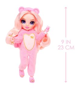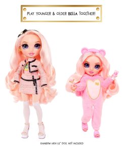 Rainbow High Jr High PJ Party Bella is dressed in a soft pink onesie and matching pink slippers. She has an adorable younger face sculpt, beautiful long curled pink hair, long eye lashes and glass eyes.