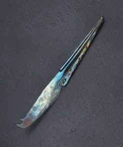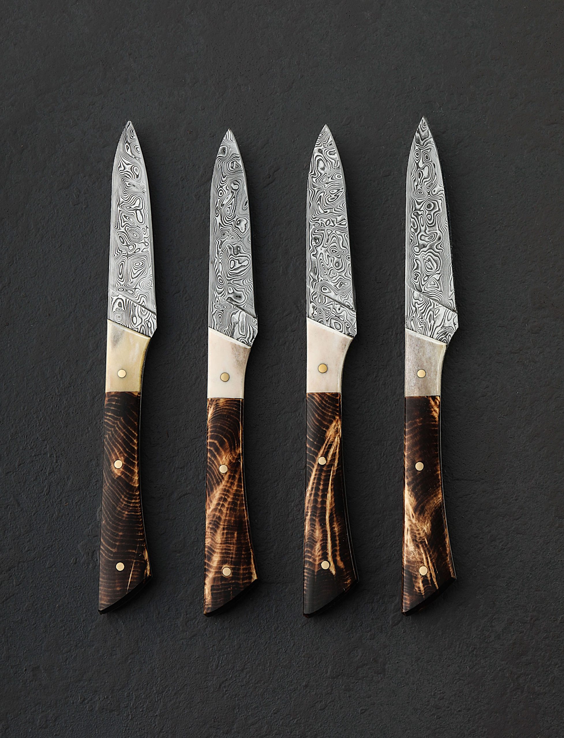 For an unforgettable dining experience comes a one-of-a-kind set of table knives in Damasteel stainless damascus, handcrafted in Åre, Sweden by artist Torbjörn ‘Tobbe’ Lundström. Elegantly designed and made for everyday use at the dining room table, each knife features a handsome handle of locally sourced spruce burl, fitted with reindeer antler bolsters, and fastened with brass pins and a single mosaic pin. The blades are sharp, lightweight, and will complement a wonderful variety of table setting styles. The set will arrive in a box made from reclaimed barn siding as is customary of Tobbe’s culinary creations.