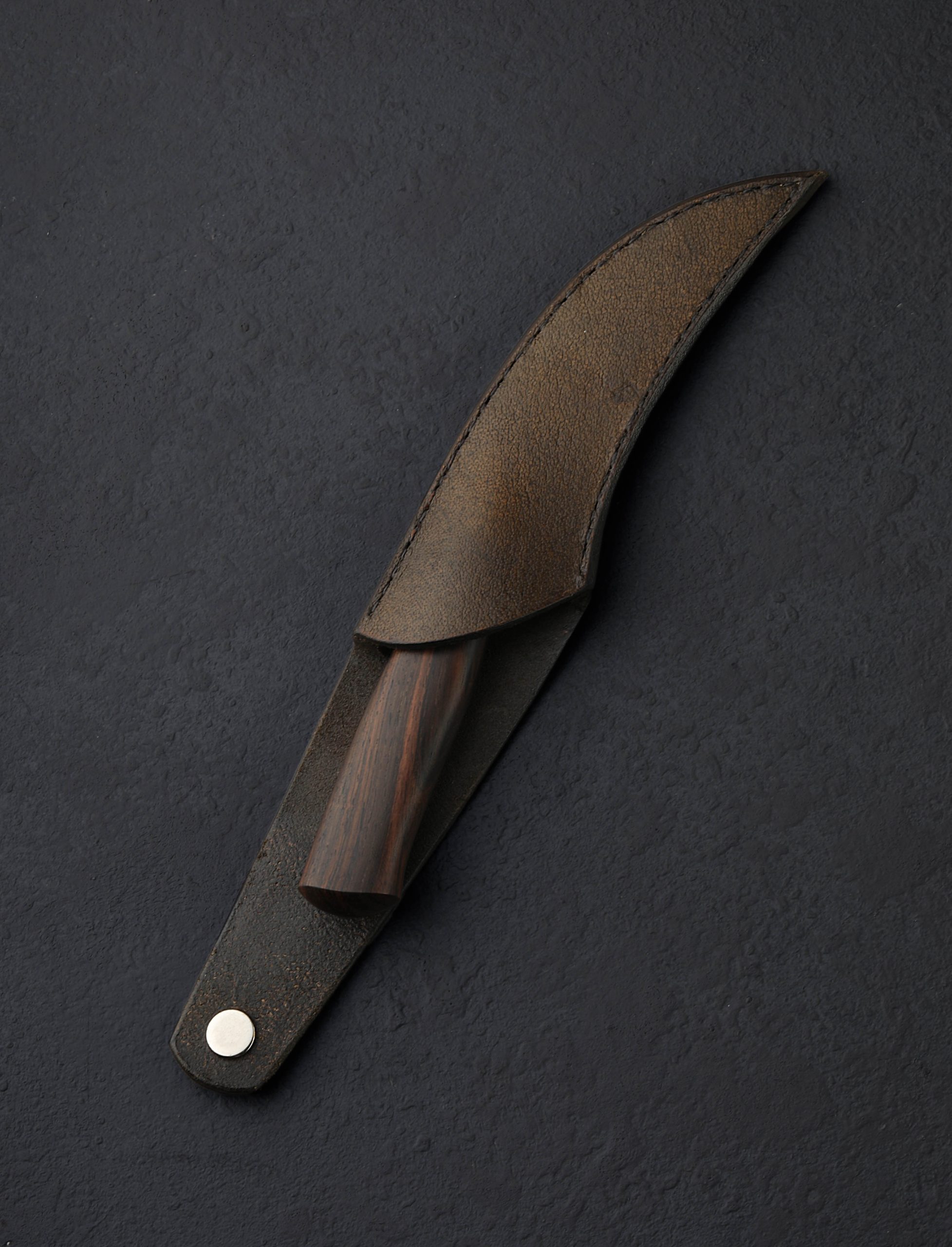 Handled in Brazilian Rosewood and delivered with a buffalo leather saya, this William Porto bird’s beak paring knife was forged by hand at William’s studio in Brazil’s southernmost reaches. The long, curved blade of 5160 carbon steel receives a dark, matte, phosphated finish for toughness and protection from the elements. Razor-sharp beneath convex bevels, the blade is crafted to perform, perfect for handheld carving and peeling work above the board in the kitchen, and just as utile while foraging in the great outdoors. As expected of every piece by this extremely talented artist and bladesmith, the craftsmanship and finish are superb in every way, from the rounded blade spine’s distal taper to a fine, needle-like tip, to the soft, sculptural edges of the blade’s choil and bolster transition, to the forged integral bolster itself, and the heirloom fit-up between steel and hardwood. Comfortable and balanced in the hand, any bird’s beak parer makes a versatile and handy addition to the chef’s arsenal, and this build by Mr. Porto is outstanding in every way.