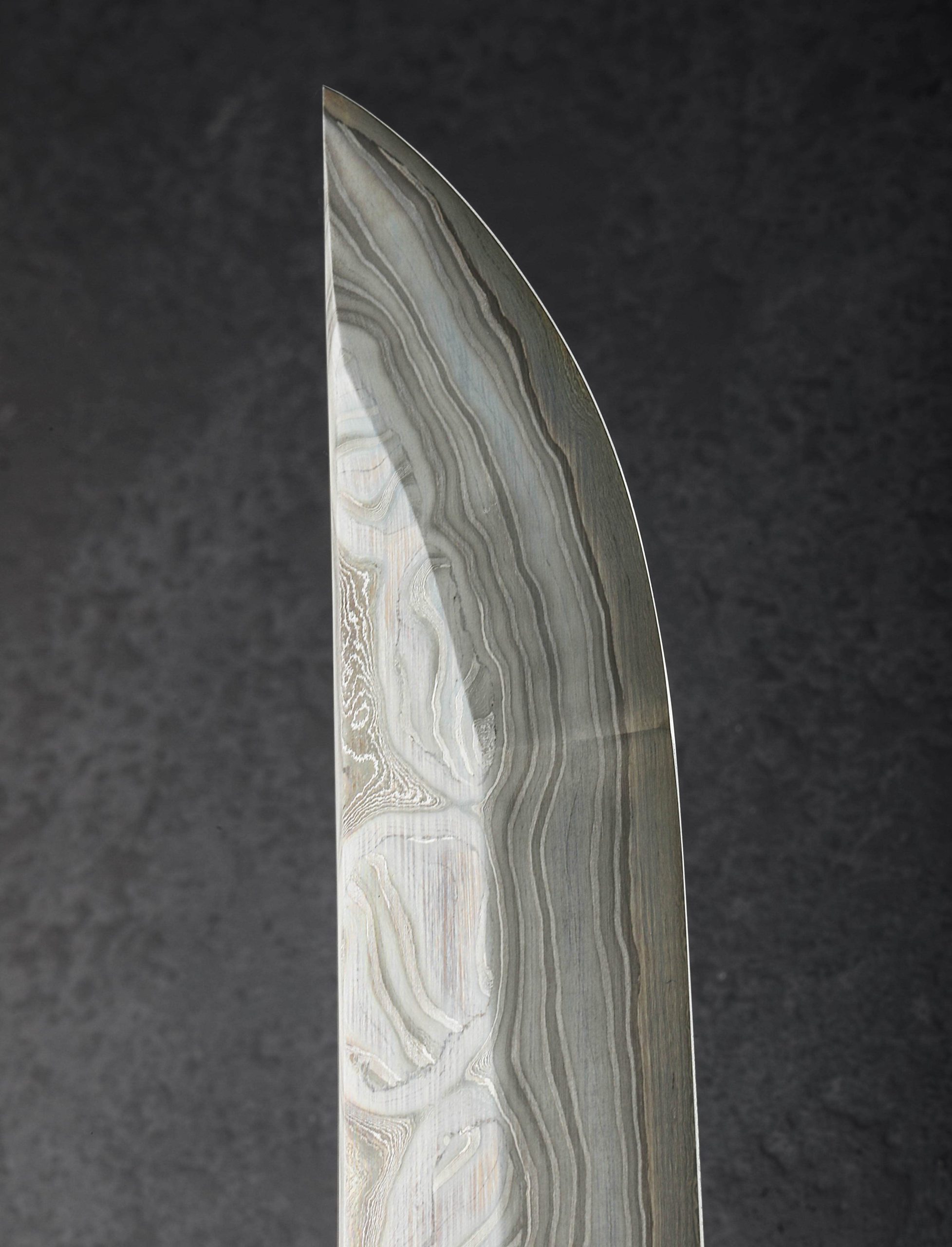 Over 350 years of bladesmithing and metallurgy expertise as one of Japan’s longest-running blacksmith shops reaches extraordinary heights with the Fantasy Line by Nigara Hamono. This single-bevel sakimaru sujihiki blade represents the pinnacle of the shop’s offerings, a culinary object as rare and exquisite as any in the world. The Nigara family began forging steel in the early Edo period, producing swords for the Tsugaru clan, and today it is run by the 7th-generation Mr. Toshiju Yoshizawa, and his son, the 8th-generation lead blacksmith Go Yoshizawa. This one-of-a-kind tool is designed for sashimi preparation by a right-handed chef, the long, slim edge and gently curved sakimaru-style tip made for cutting in one fluid motion in order to preserve the cellular structure of the fish. The hand-forged blade is constructed from a san-mai (three-layer) formula consisting of an edge in densely layered White No.2 and Blue No.2 carbon steels, with lightly etched damascus cladding of Go’s design and making. The blade comes without handle so that the owner can select the style, materials, and shape of their preference.