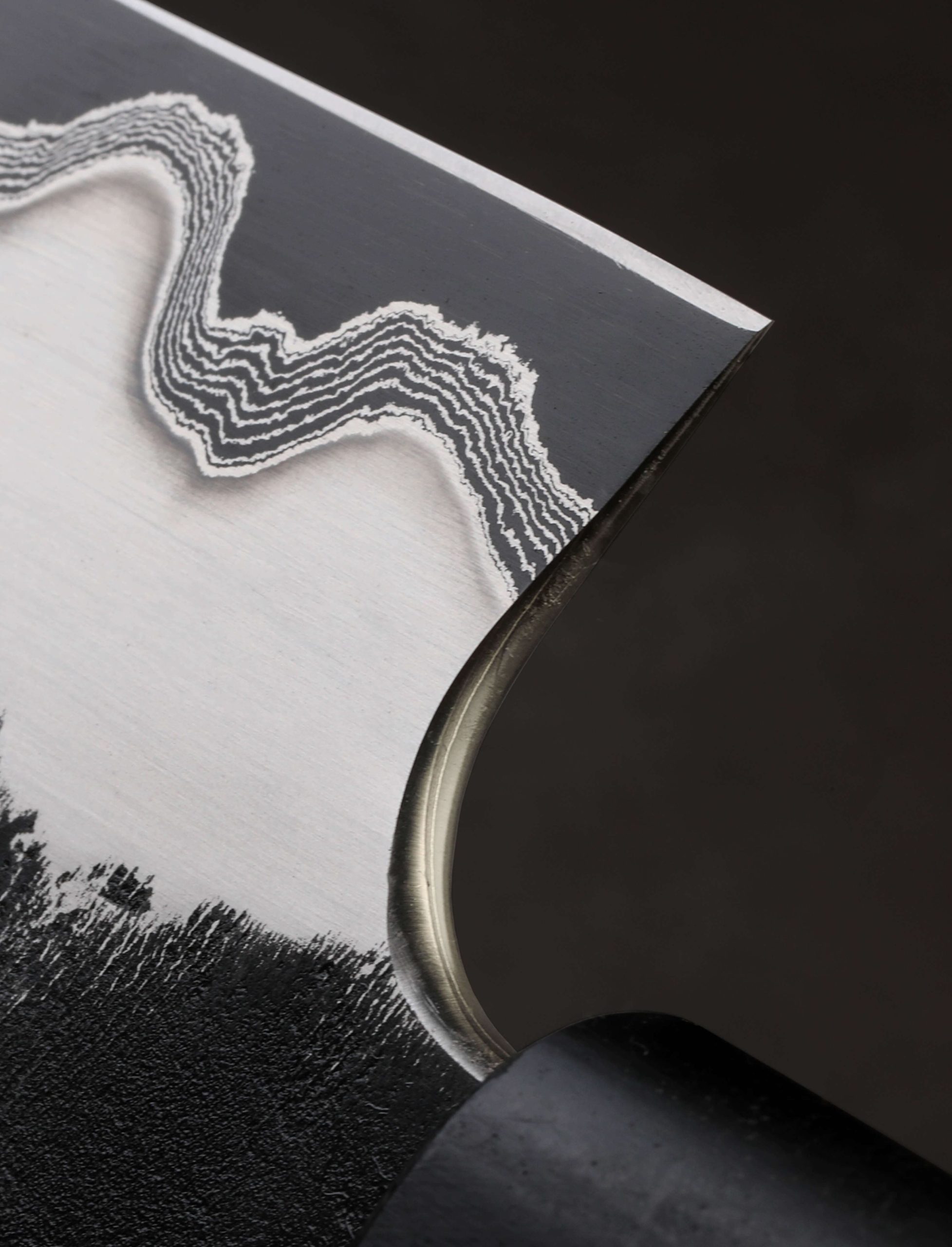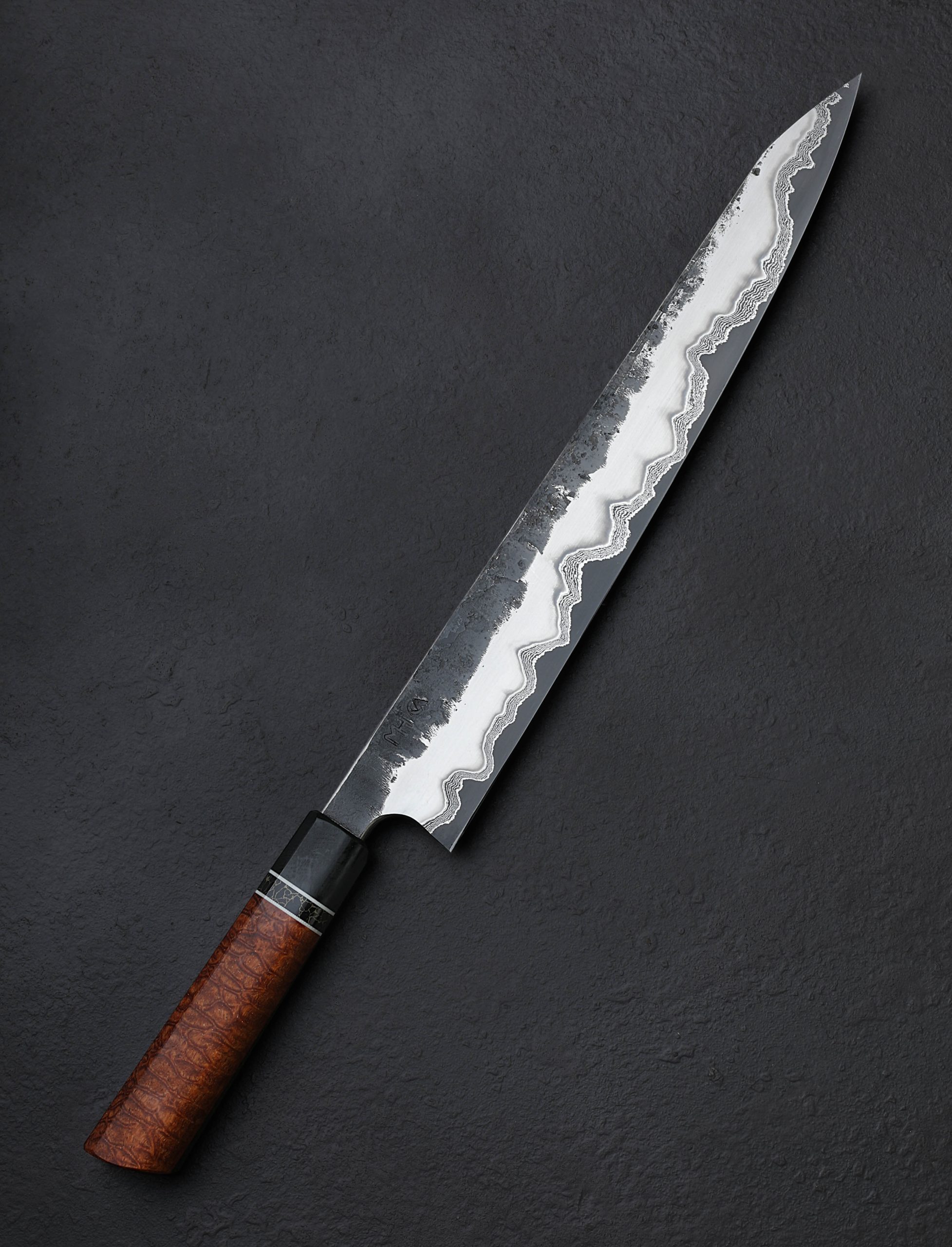 Forever innovating and dreaming, Austrian bladesmith Martin Huber’s unique material combinations and steel layering techniques have produced a robust and fearless sujihiki with a razor-sharp edge that stretches for 317mm from heel to tip. At the cutting edge with its deep, matte gray finish is the core of 1.2419 high-carbon steel. Atop the 1.2419 is inner cladding of 30-layer damascus created from pure nickel and O2 steel. Above that to complete the ‘San-Mai-Mascus’ formula is outer cladding of stainless steel that boasts a beautiful, silky hand-sanded satin finish as well as a dark, textured, forged-finish along the flats that tells the story of the blade’s hand forged origins. Standing a knuckle-clearing 47mm tall at the heel where Martin maintains tough and durable edge geometry, this knife can be used for gyuto-style chopping and prep work for chef’s who appreciate an especially large blade. That stout edge geometry in the rear of the profile then begins to taper, becoming steadily and progressively slimmer moving toward the tip, producing a versatile tool that will perform the fine slicing and carving duties of a sujihiki slicer with flying colors. A touch of lateral flexibility is present in the final inches, and then, the paper-thin, needle-like tip is reached. For comfort and control over this potent, one-of-a-kind object is a handle that shines with the grain and natural beauty of a hardwood we rarely see: afzelia xylay. Seeming to mimic the grain of the wood is a piece of black and gold TruStone, a sustainable composite made from crushed stones and resin, jacketed between rings of white G10, and capped with a bolster of ancient bog oak. Tipping the scales at just 10.5oz / 296g overall, the power and steadiness felt when holding this tool is difficult to put into words.