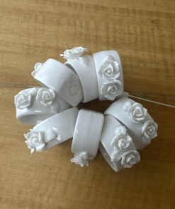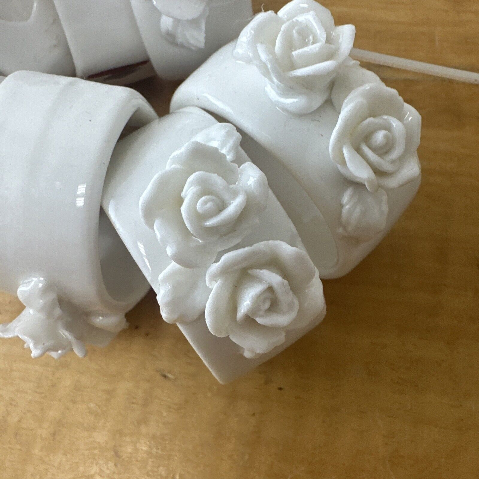 Set of 8 White Porcelain Napkin Rings Carved Roses Baby Shower Wedding Vintage
