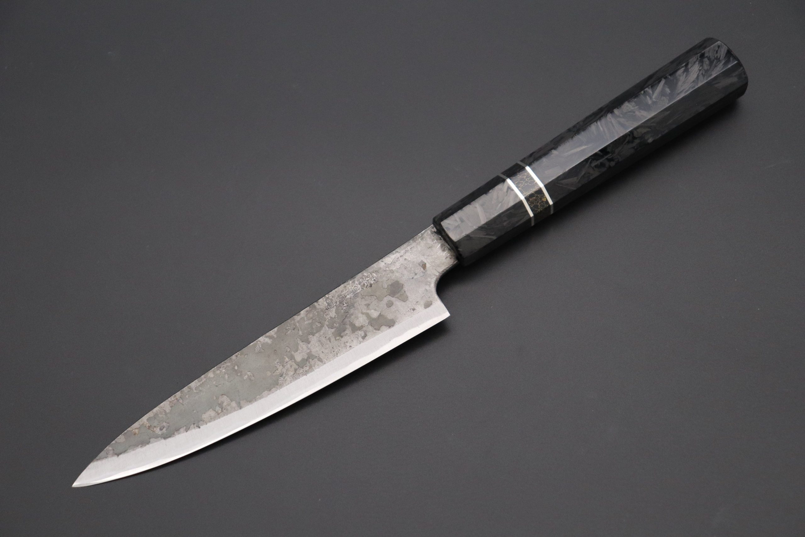 This Special Edition Wa Petty Knife with Contemporary, Stylish Wa Handle. The Innovative Octagonal Carbon Fiber Handle with Composite Black Color Turquoise Gemstone Ring and Nickel Silver Spacers.