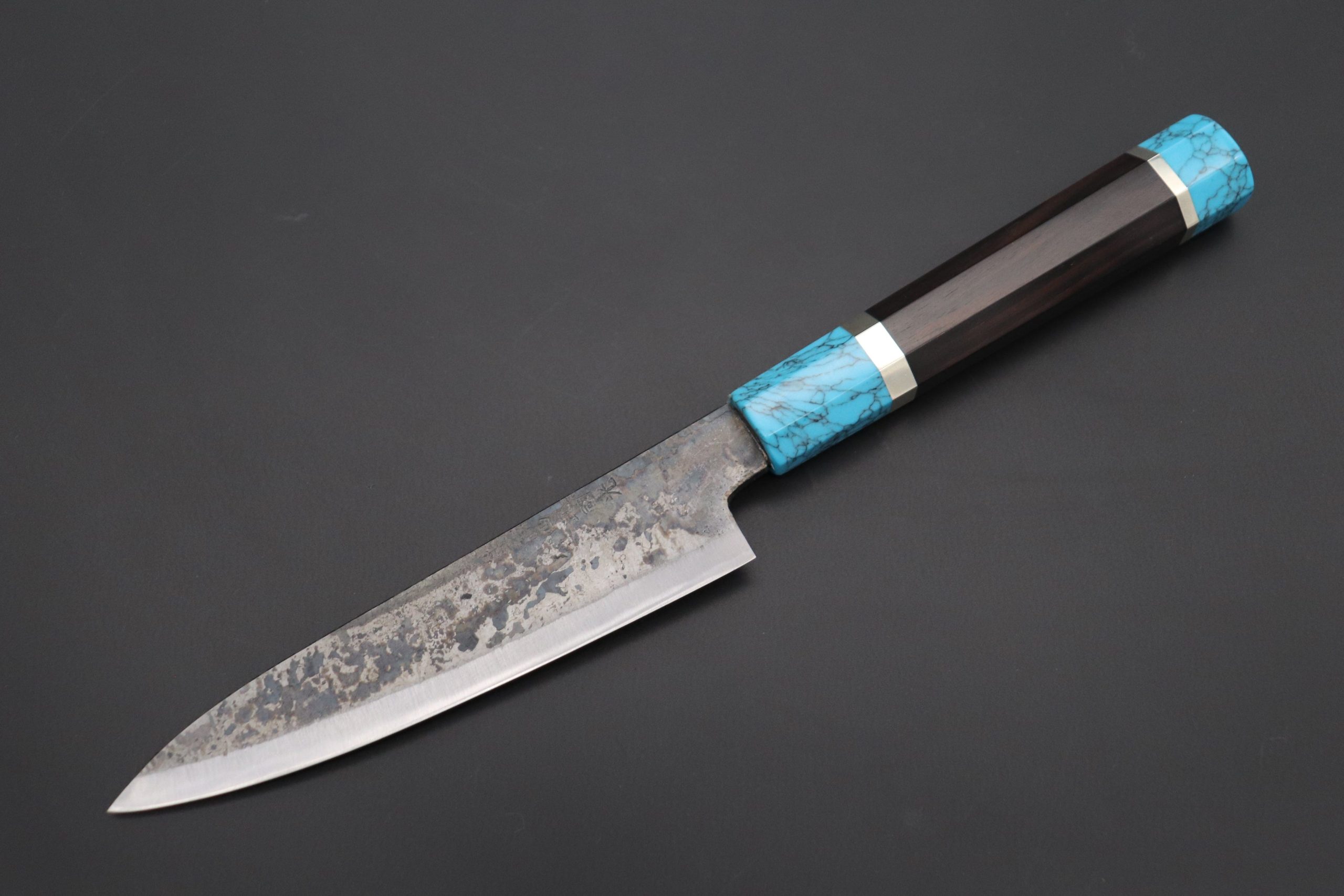 This Special Edition Wa Petty Knife with Contemporary, Stylish Wa Handle. The Innovative Octagonal Ebonywood handle with Turquoise Gem-Composite Stone Ferrule & Butt with Nickel Silver Spacers.