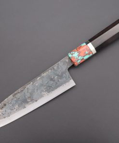 This Special Edition Wa Santoku Knife with Contemporary, Stylish Wa Handle. The Innovative Octagonal Ebonywood handle with Fancy Green & Pink Turquoise Gem-Composite Stone Ferrule & Butt with Nickel Silver Spacers.