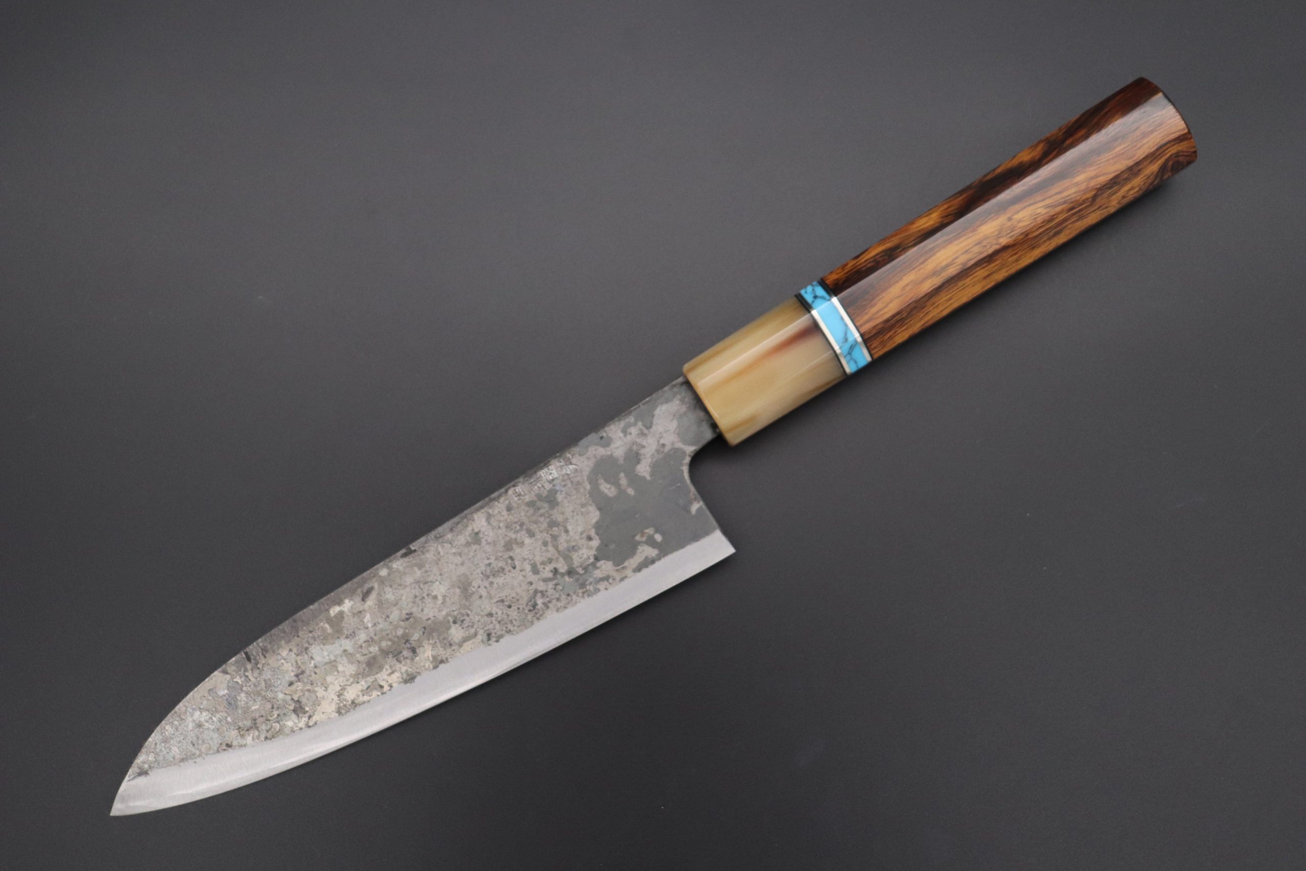 This Special Edition Wa Santoku Knife with Contemporary, Stylish Wa Handle. The Innovative Octagonal Desert Ironwood Handle with a Marble Colored Water Buffalo Horn Ferrule, a Composite Turquoise Gemstone Ring and Nickel Silver Spacers.