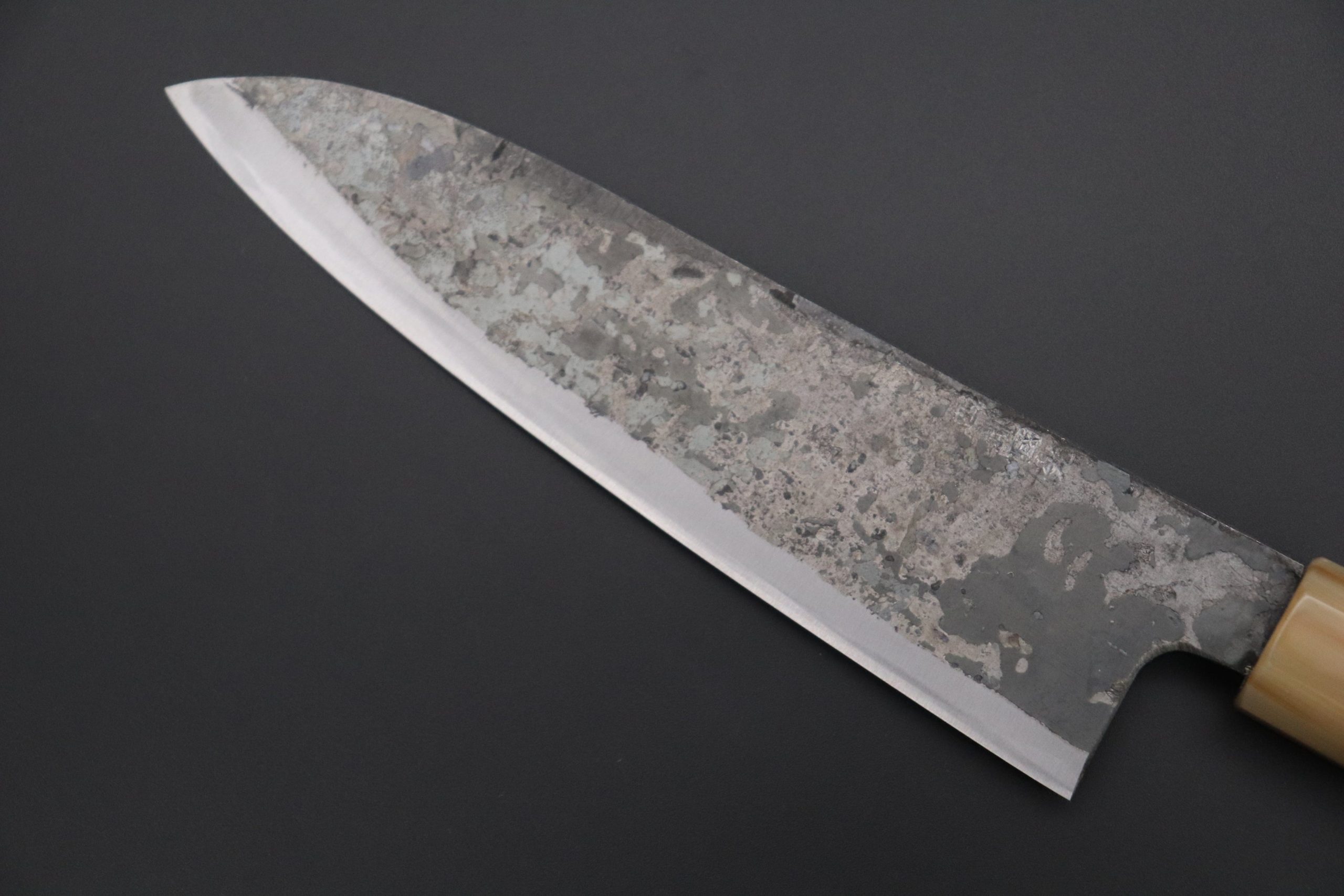 Each one of the unique Kurouchi (“Black forged”) finished blades has an uneven surface and a non-uniform finish. So, if you are looking for a very neat knife, with precise details and great ‘fit & finish’, these Shirou-Kunimitsu handmade traditional forged knives are not well suited to your preferences. However, at the same time, we really appreciate the originality and artisanal spirit of these knives and we think the traditional Kurouchi finish is something really special — We can feel the WABI-SABI aesthetics striking at our hearts and we hope our customers will feel the same way.