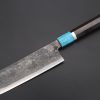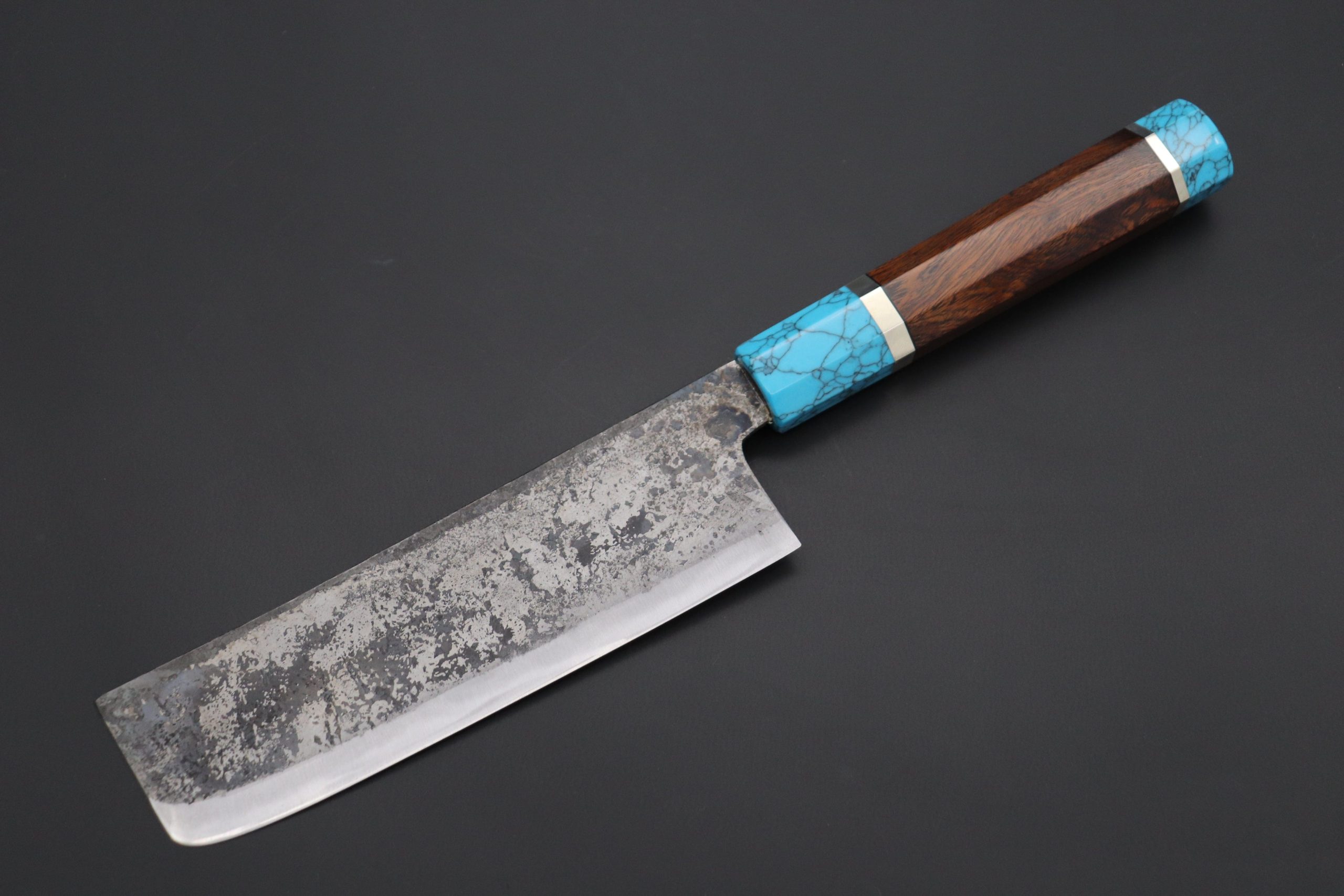 This Special Edition Nakiri Knife with Contemporary, Stylish Wa Handle. The Innovative Octagonal Desert Ironwood handle with Turquoise Gem-Composite Stone Ferrule & Butt with Nickel Silver Spacers.