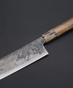 Each one of the unique Kurouchi (“Black forged”) finished blades has an uneven surface and a non-uniform finish. So, if you are looking for a very neat knife, with precise details and great ‘fit & finish’, these Shirou-Kunimitsu handmade traditional forged knives are not well suited to your preferences. However, at the same time, we really appreciate the originality and artisanal spirit of these knives and we think the traditional Kurouchi finish is something really special — We can feel the WABI-SABI aesthetics striking at our hearts and we hope our customers will feel the same way.